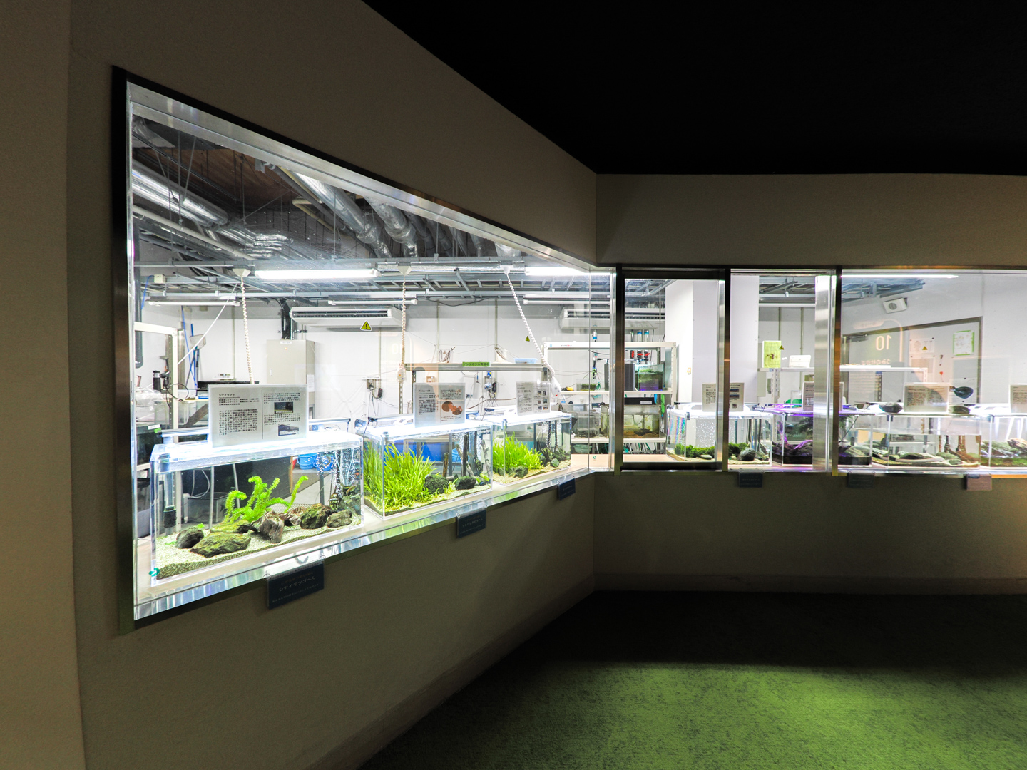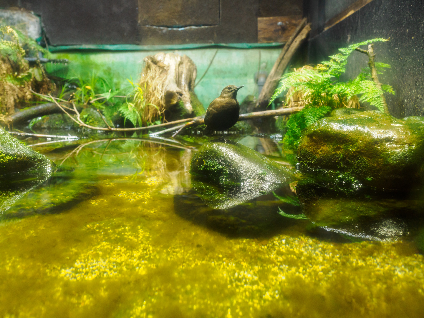 所狭しと展示している水槽。訪れた日はカワセミは休止していたのでカワガラスの展示コーナーが充実していました。