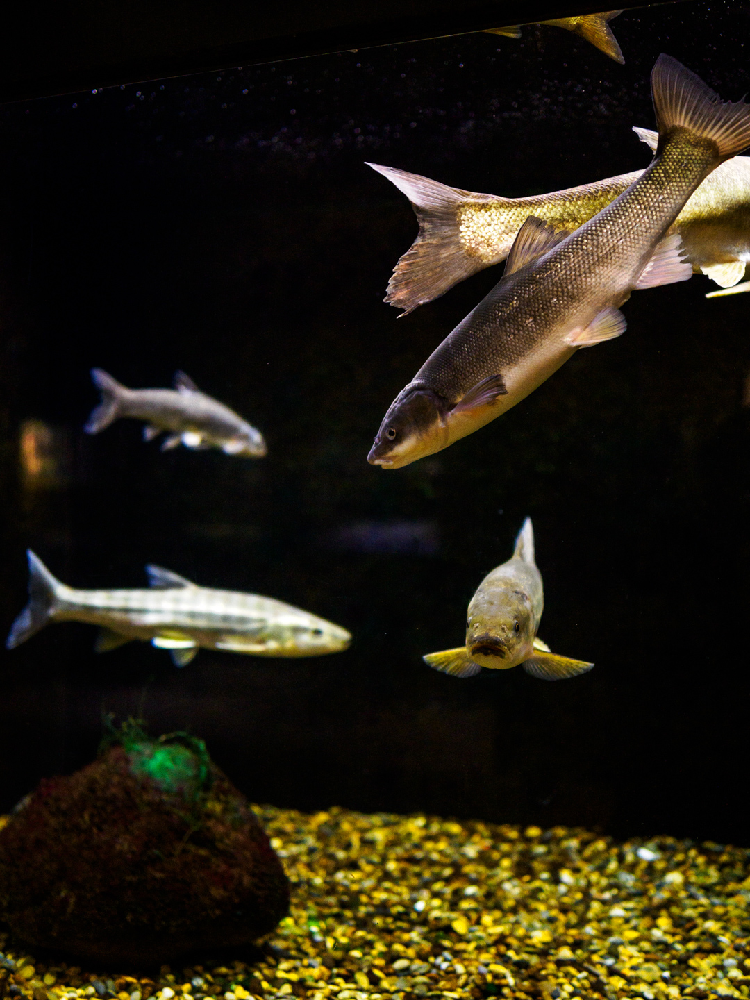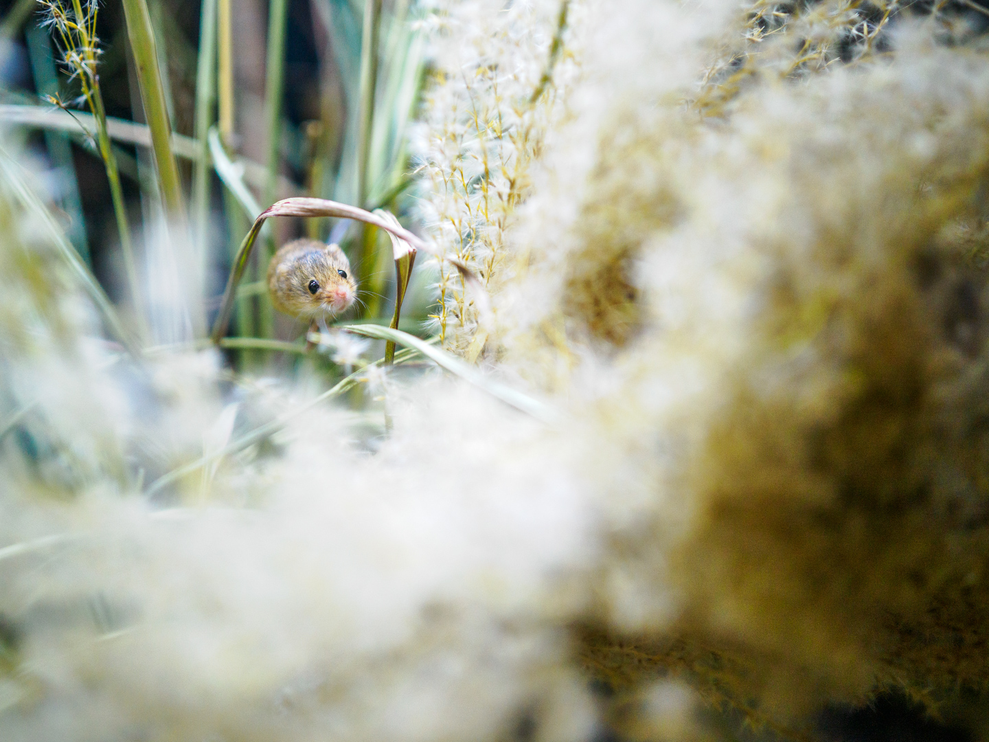 水族館の人気者カヤネズミ。ウケクチウグイなどの淡水魚メインの希少種の展示が豊富です。