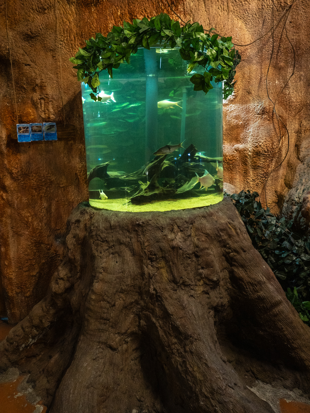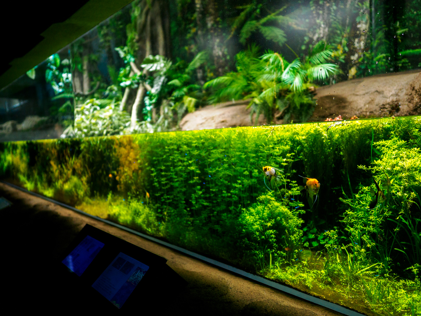 水面への映り込みが奇麗だったピラルクの大水槽。わざと背後の展示を写りこませて近未来的に。