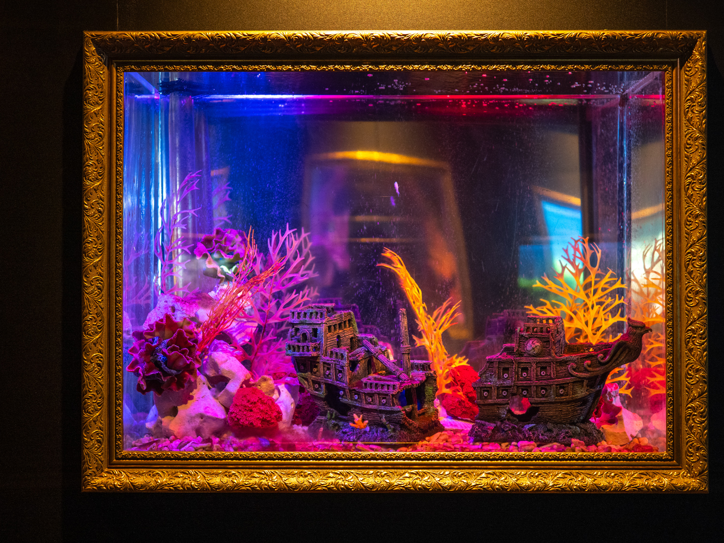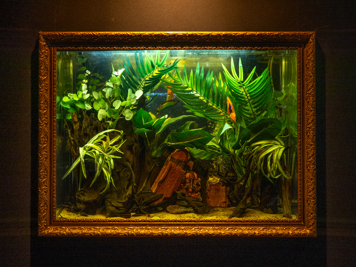 水槽の周りを絵画で使われるゴールドの額縁で装飾していて、動く絵画でした。ただ、魅せる部分に特化していて生き物の生態などには逆に触れていない部分が多いので、どちらかというと雰囲気を楽しむ水族館でした。