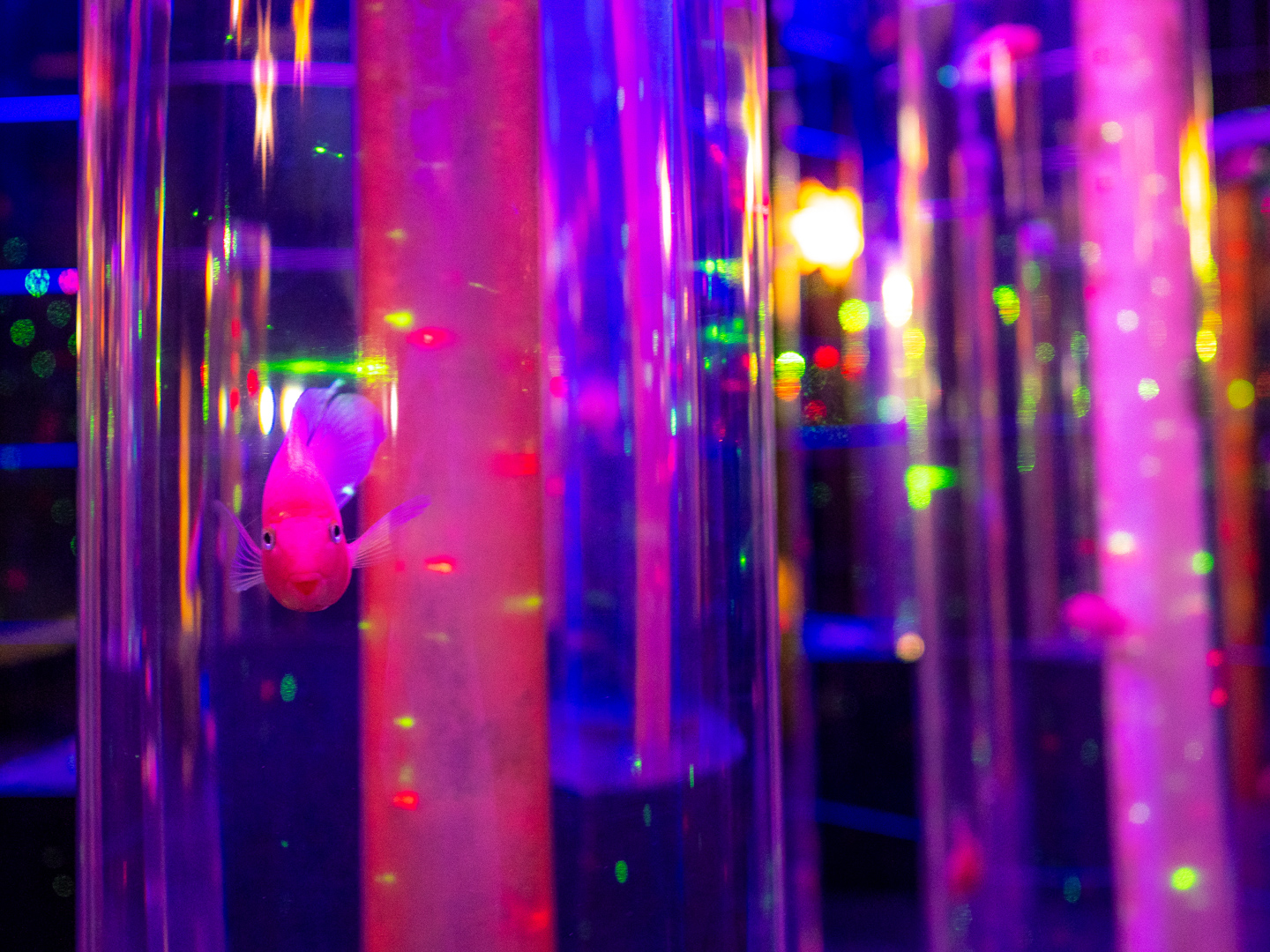 もう一つの売りである、三角水槽。このように広く撮影するとまるで不思議なオブジェのよう。