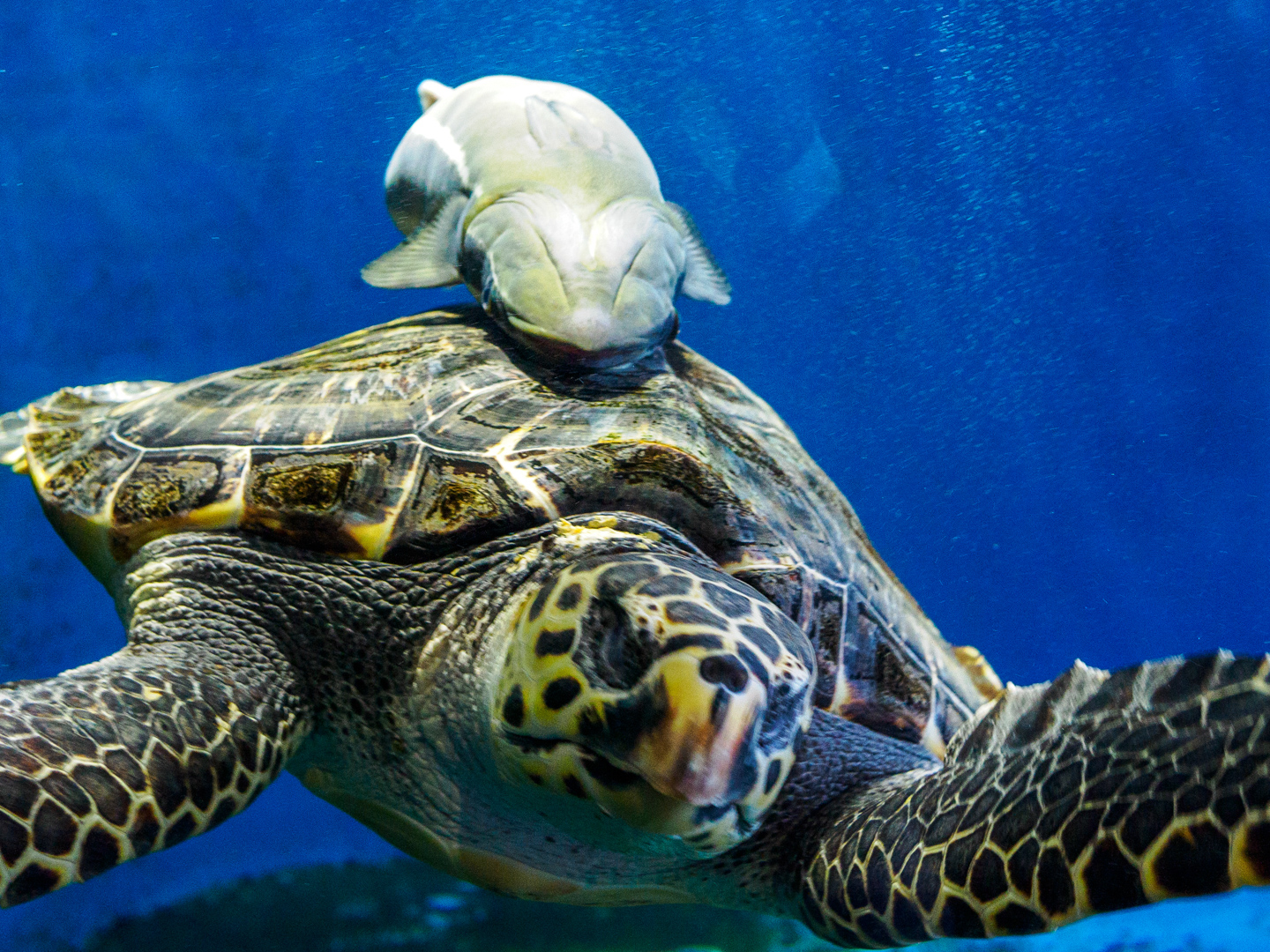 入館すると大きなコバンザメを背負ったようなウミガメがお出迎え。その隣にはなんと海洋ごみのコーナーがあり、自然環境に対する人間へのメッセージにとても考えさせられます。