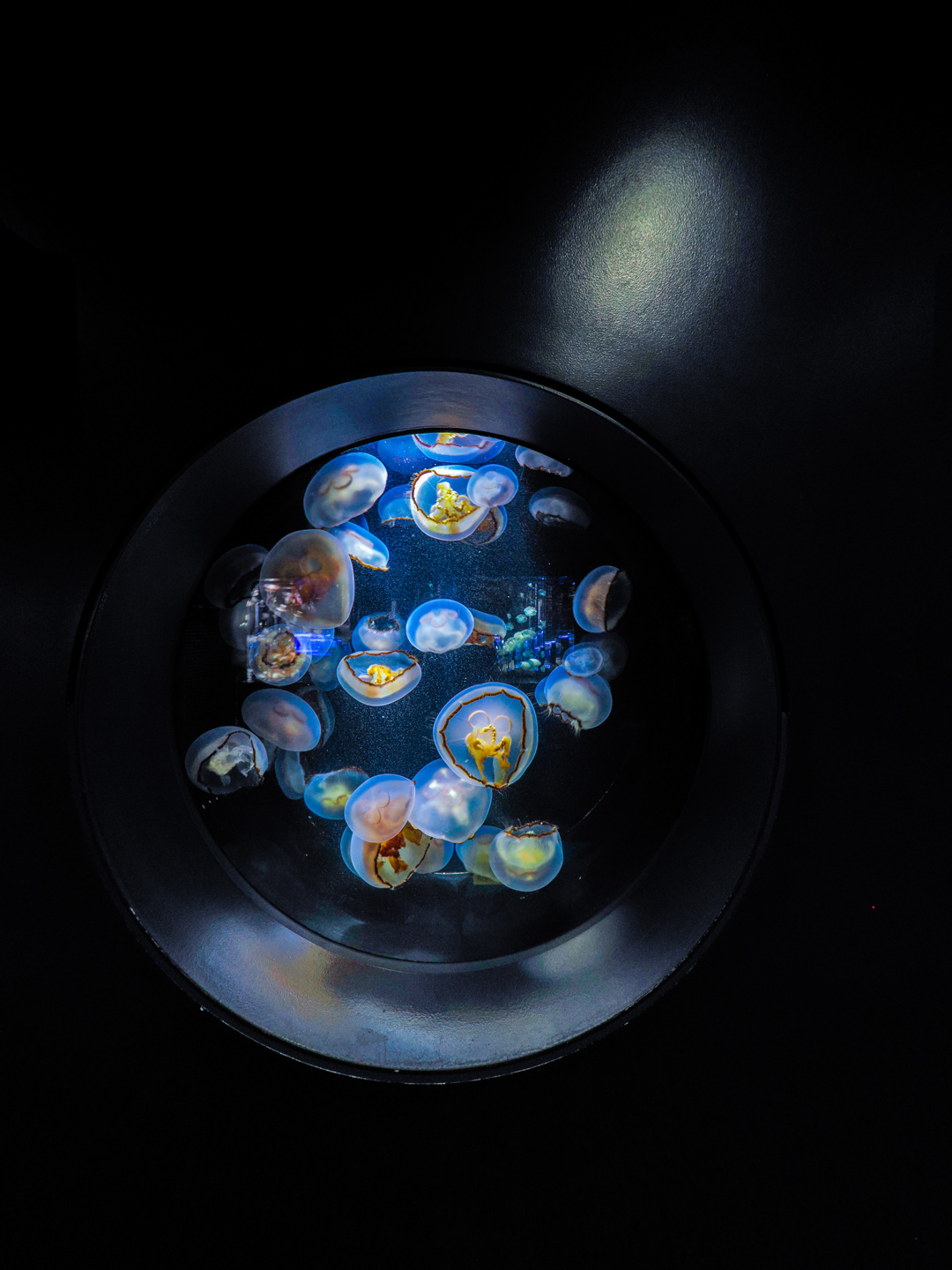 トンネル水槽を抜けると14種類のクラゲ水槽が。左下にトンネル水槽を入れて奥行き感を出してみました。