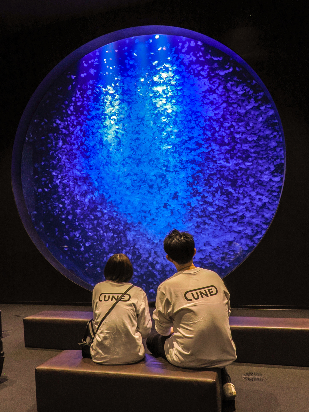とても幻想的なクラゲブース。床面の反射を利用してシンメトリーに表現しました。