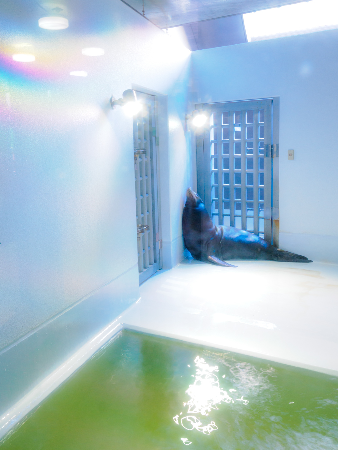 洒落た窓枠にカリフォルニアアシカがポーズをとってくれている瞬間を撮影。良い光が差し込んでいてとても幻想的でした。
