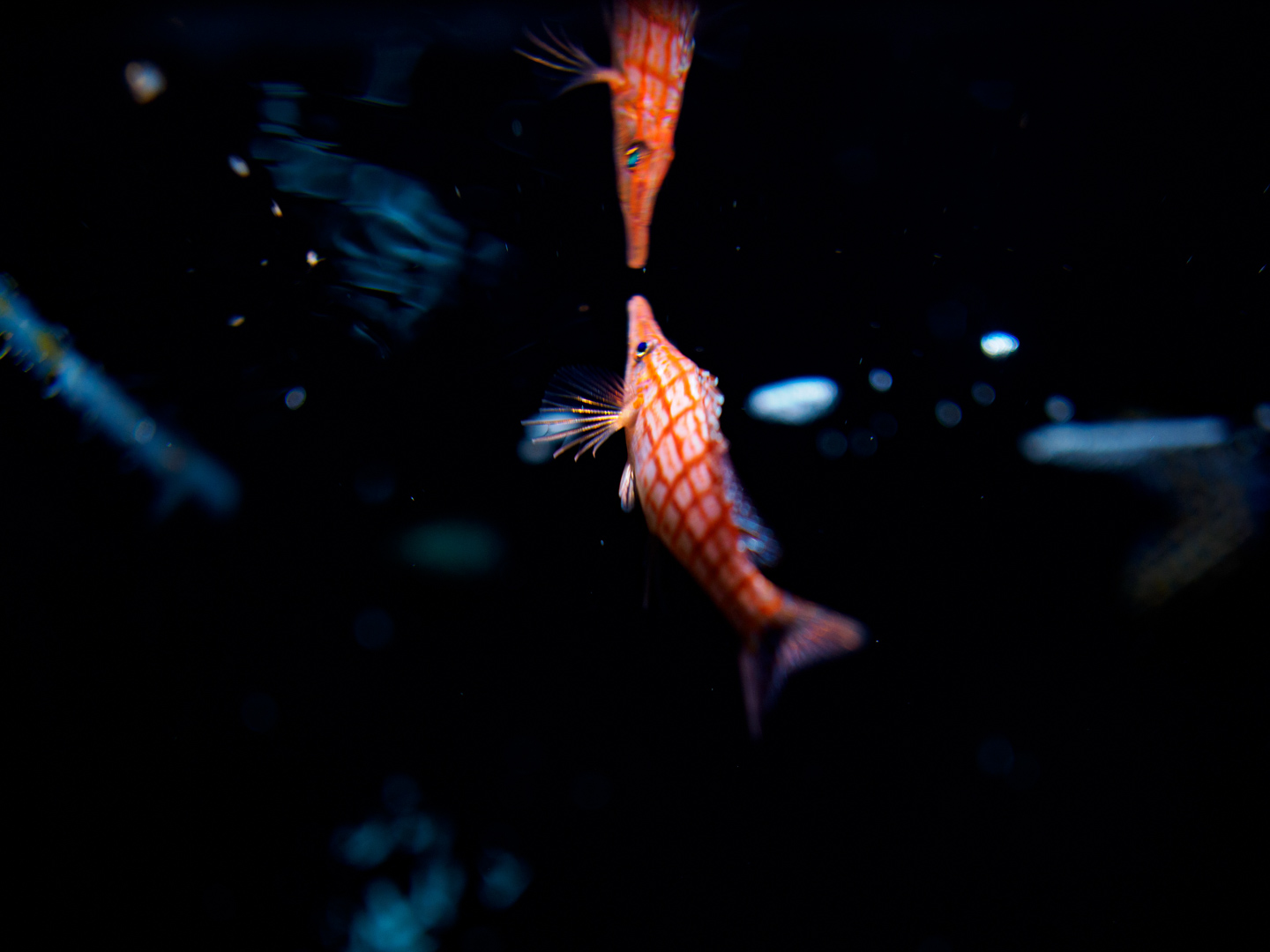 アオリイカが群れて泳いでいる水槽も周りを広く撮影すると、まるで箱の中に閉じ込められたような写真が撮影できますし、真ん中の屈折した部分を利用することで不思議な雰囲気の作品が出来上がります。