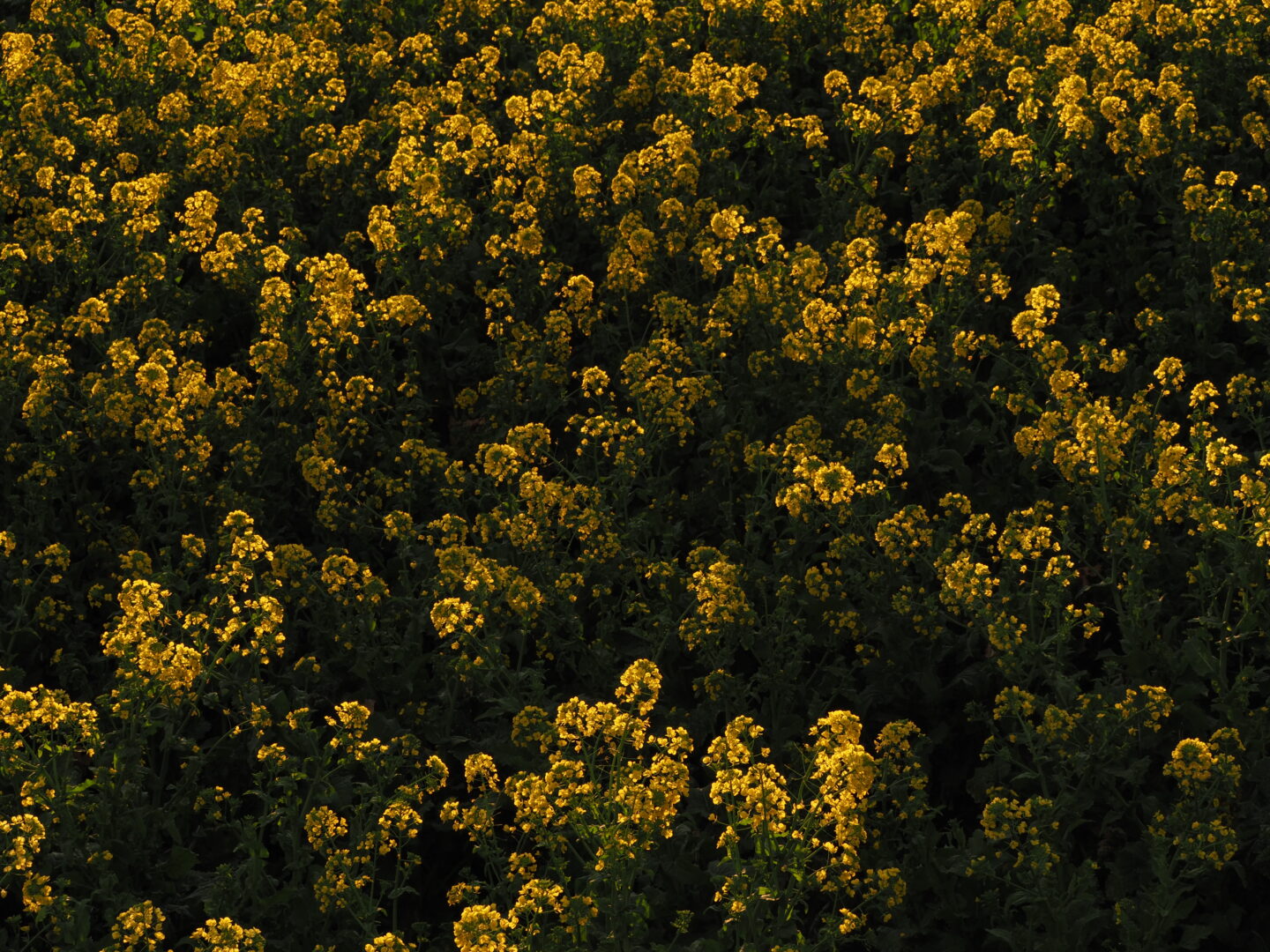 棚田に菜の花が植えられていて、上の段から見下ろすように撮影しています。普通であれば地面の茶色が入るのを嫌って、上から見下ろすアングルはあまり撮らないのですが、夕暮れの遮光線が射して、丈の高い花だけに光が当たり、下の方は影になって黒くなりました。地面が見えなくなっているので好都合でした。