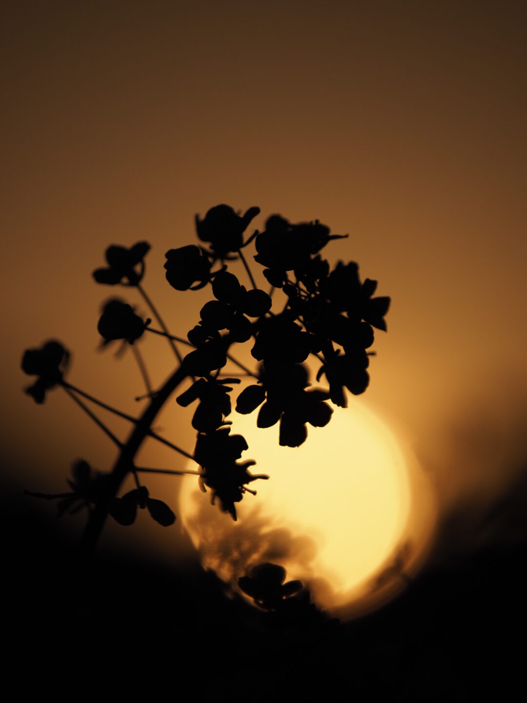 前の作品の30カットほど後に撮ったものです。より太陽が低くなり、菜の花も陰になりました。その光が当たっていない菜の花とまだ明るい夕日とでは明暗差がありますよね。そこで、ピントは主役の菜の花に合わせつつ、露出は夕日に合わせました。すると、このようなシルエットの写真になります。露出は主役に合わせるのが基本ですが、ここで菜の花に合わせてしまうと、背景はそれより明るいのでオーバーになってしまいます。