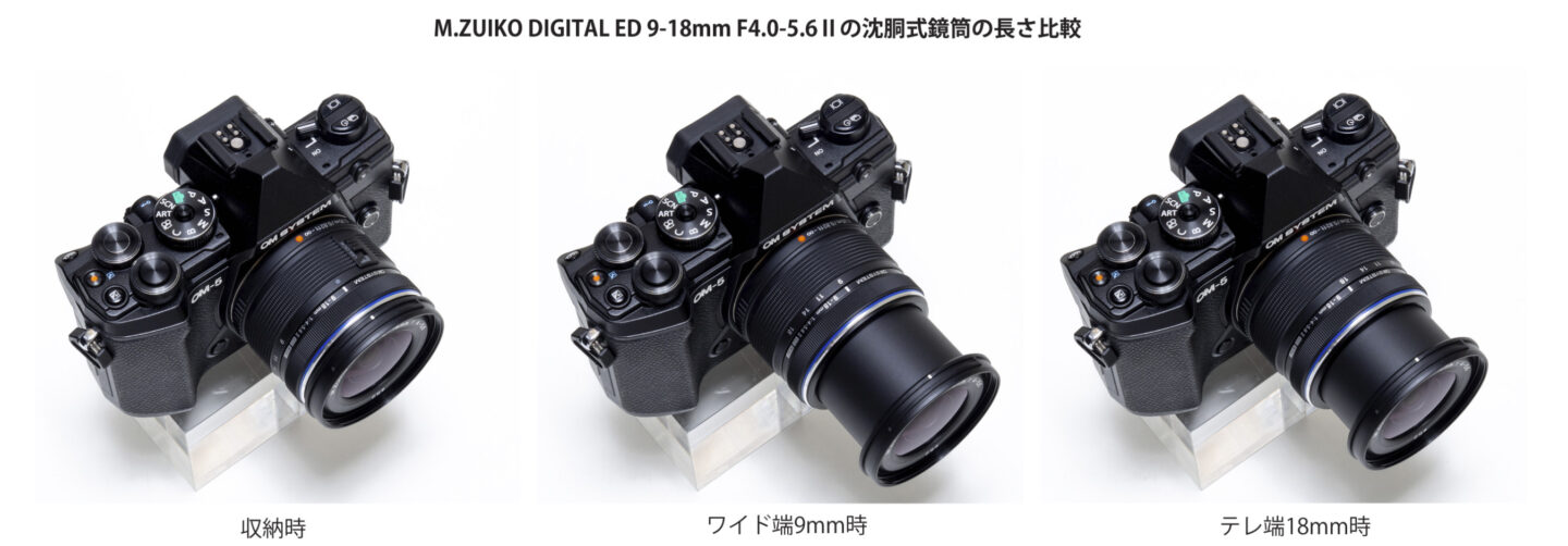 M.ZUIKO DIGITAL ED 9-18mm F4.0-5.6 IIは未使用時には鏡筒の長さを短くして収納することができる沈胴構造を採用している。撮影時はズームリングを回転して鏡筒を伸ばす。収納する際には鏡筒に設けられたUNLOCKレバーをスライドした状態のままズームリングを回転して鏡筒を縮めればよい。