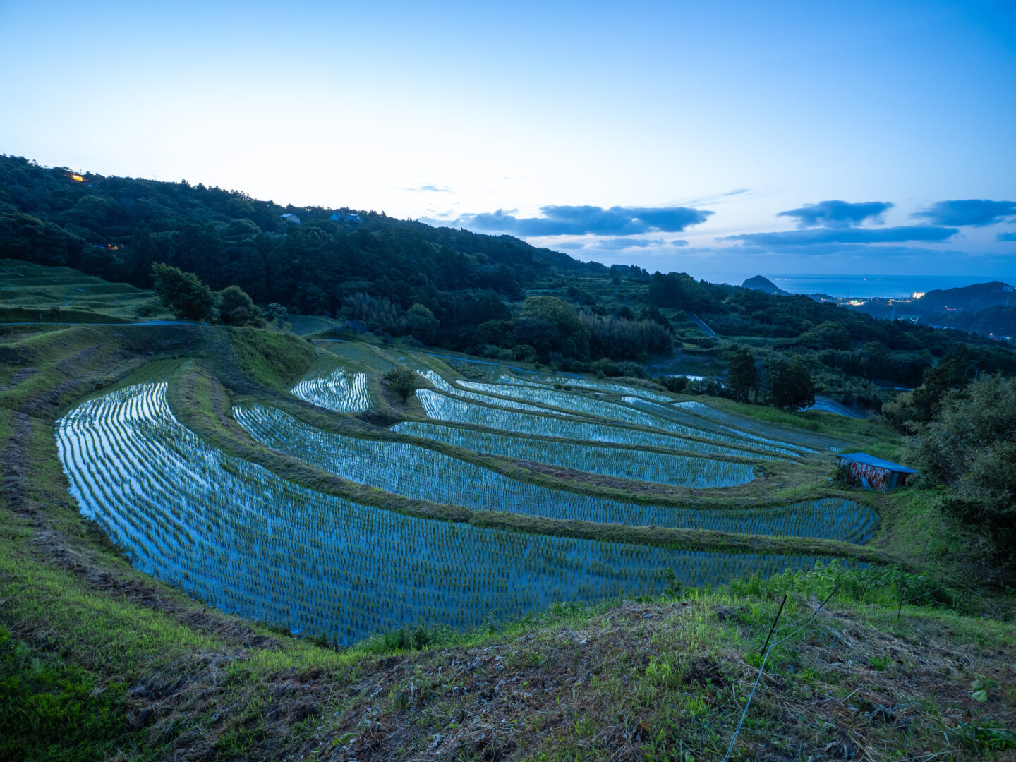 満月の夜に月明かりで撮影した棚田の風景。限られた明るさでも丁寧に光をすくい上げることで、日中とは違う風景を写真に収めることができる。
