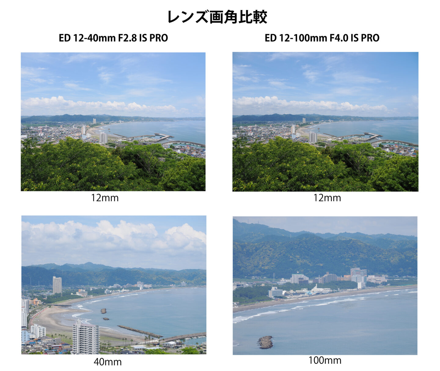ED 12-40mm F2.8 PRO IIとED 12-100mm F4.0 IS PROの仕様を表にした。この表から特徴を読み解くと、焦点距離はどちらも広角端においては12mm(35mm判換算24mm相当)だが、望遠端はED 12-40mm F2.8 PRO IIが40mm(35mm判換算80mm相当)と中望遠域までとなっているのに対して、ED 12-100mm F4.0 IS PROは100mm(35mm判換算200mm相当)の望遠域までカバーしているのが大きな特徴だ。このようにED 12-100mm F4.0 IS PROでは、このレンズ一本のみで広角から望遠まで、より幅広い画角を選択できる。
