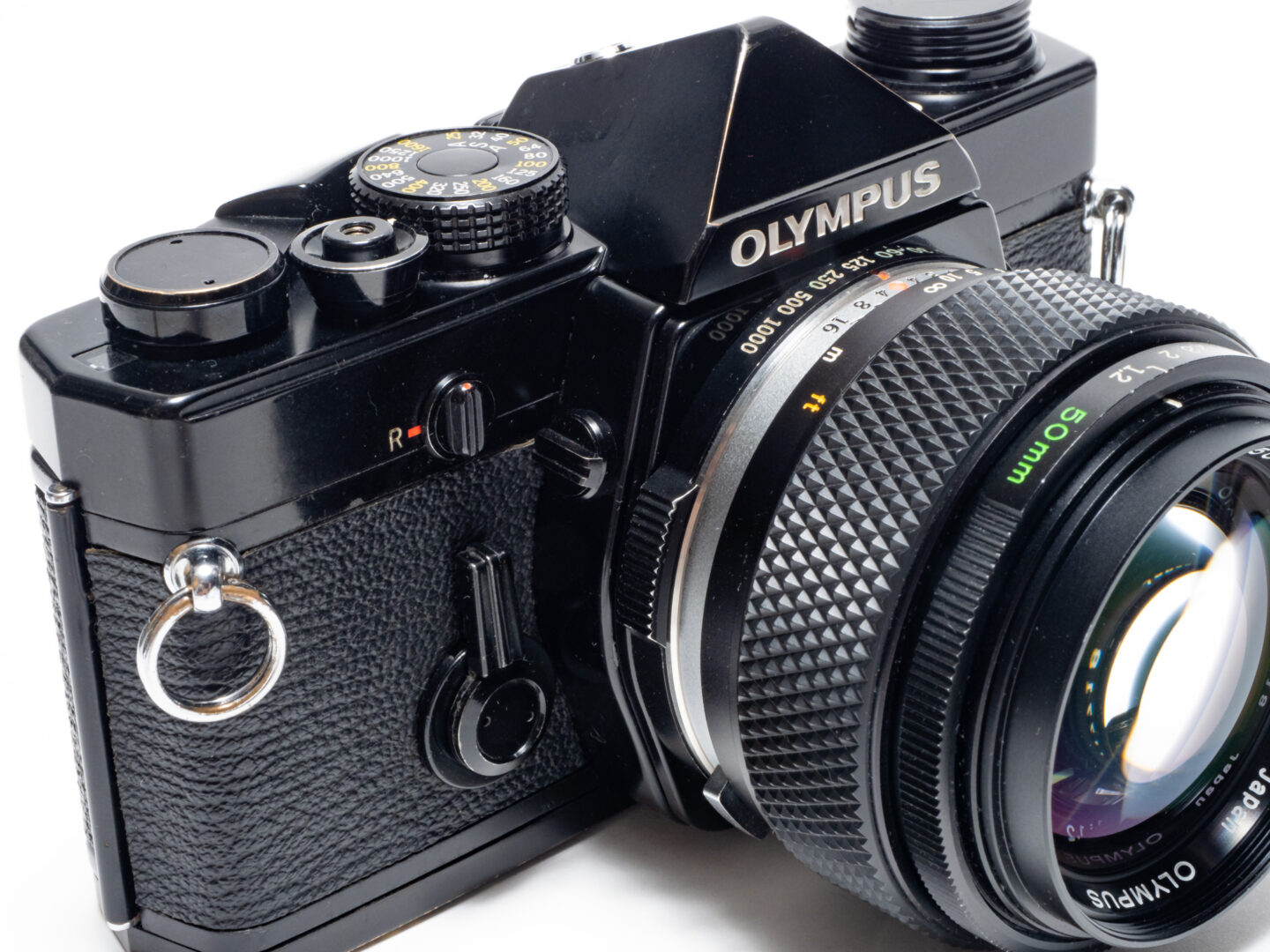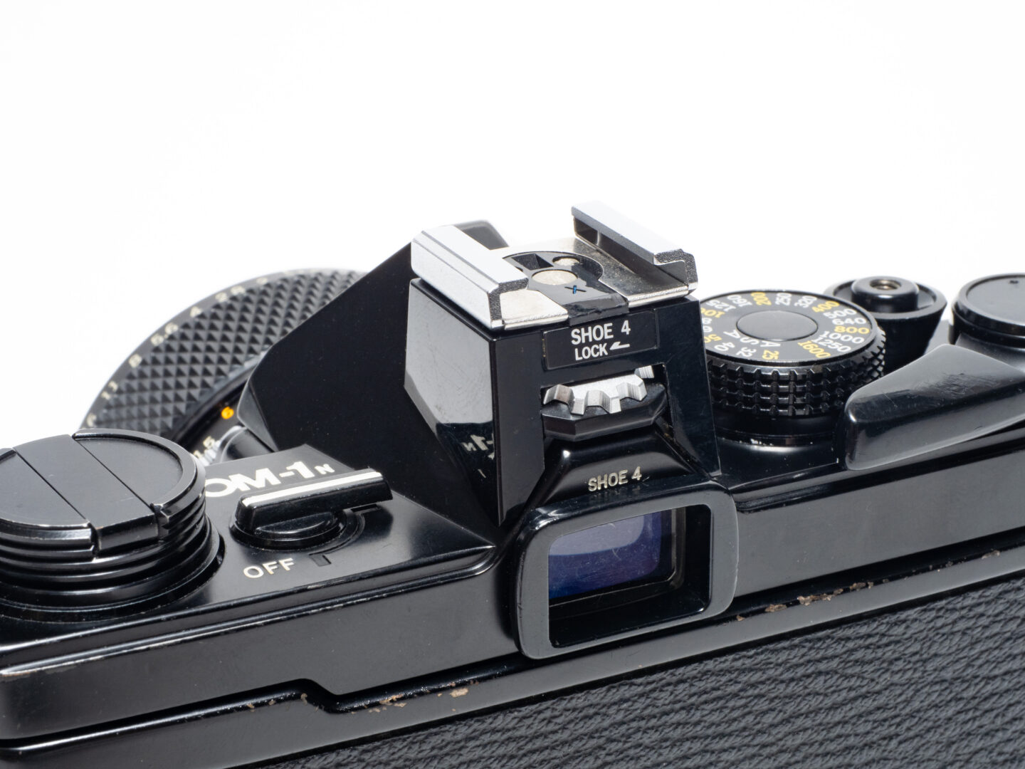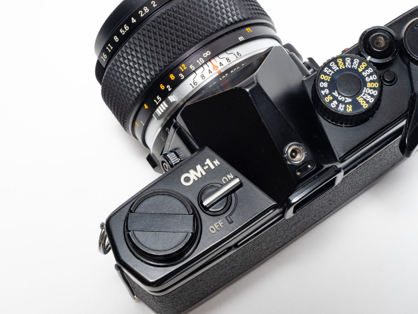 なおシャッターの作動音はとても小さく振動も少ない。これもOM-1シリーズの開発コンセプトのひとつである撮影時の静粛さを実現したものだ。大きなダイヤルはフィルム感度設定用のもの。表記がASAとなっているがこれは当時の規格名称。現在のISOと数値は共通なので、使用するフィルムのISO感度数値に合わせれば良い。