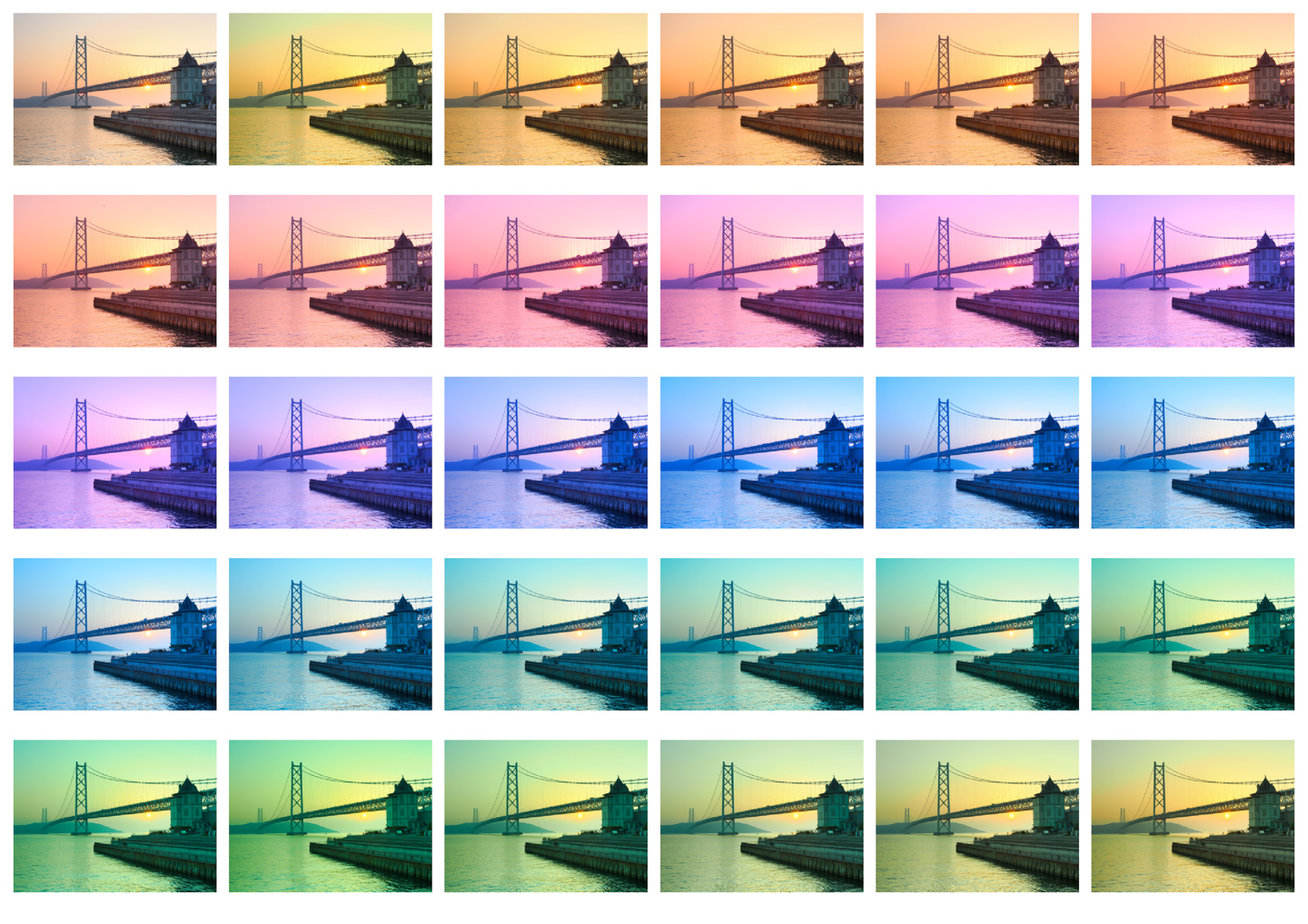 明石海峡大橋の夕景をカラークリエイターを用いて撮影しました。カラー0から29までのフィルターをひとつずつ用いて撮影し(彩度は+3)、並べてみると、カラーチャートのような一覧が出来上がりました。(笑)