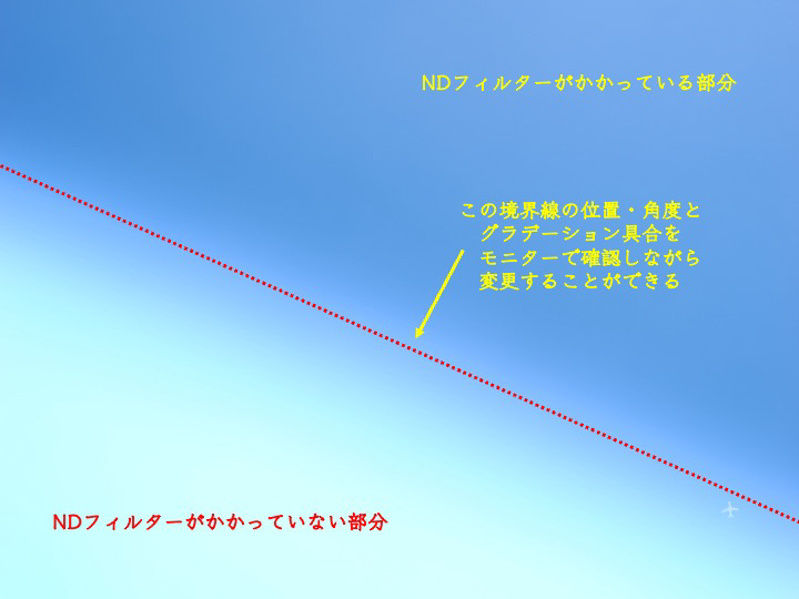 NDフィルターの濃さもGND2/GND4/GND8から選択でき、またND効果のある・なしの境界ラインの強弱も3段階から選べます。しかも明暗差に合わせてフィルターの位置や角度をボタンとダイヤルで調整できるというすぐれもの!そして「ライブ」という単語がついているだけに、液晶モニターで効果を確認しながら撮影できます。