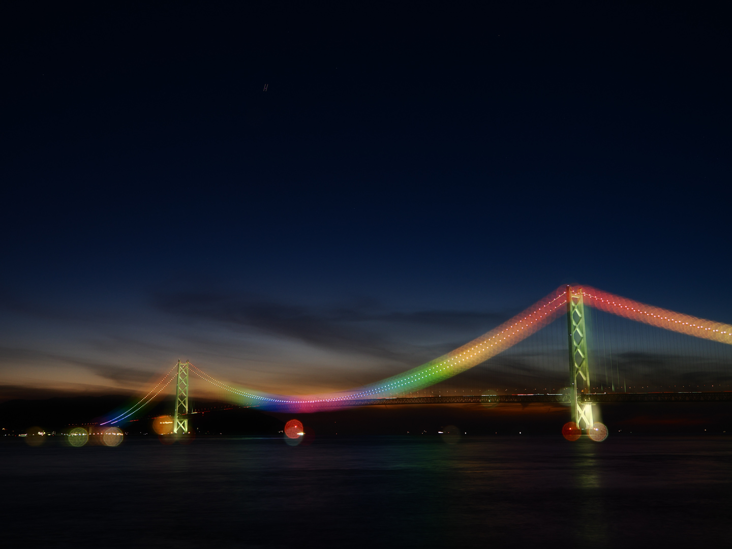 明石海峡大橋にピントを合わせた画像と、マニュアルフォーカスでピントをずらしてライトアップされた光を玉ボケにした画像の2枚を1枚に重ねました。OM SYSTEM機では、続けて2枚を重ねる撮り方だと合成後の1枚のみが記録されます。(JPEGのみ、RAWのみ、JPEG+RAWから選択できます)
