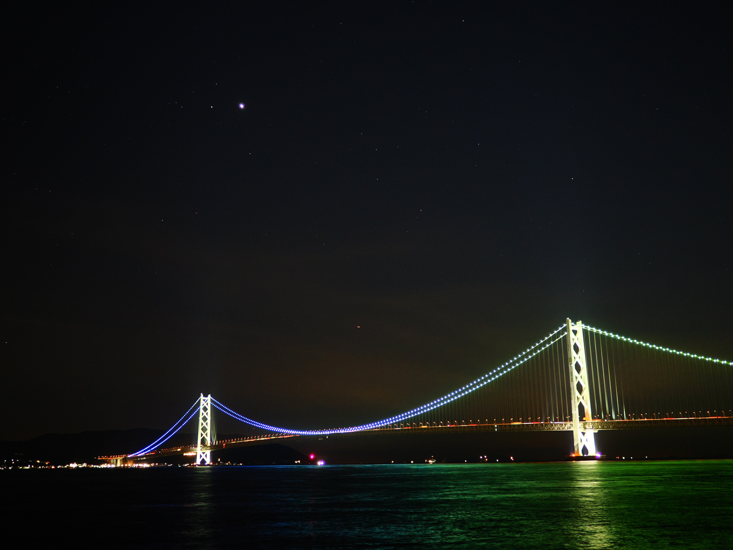 明石海峡大橋と星空を撮影。VividよりもCP3の方が夜空はしっかり暗く、橋のライトアップと星は鮮やかに表現できています。