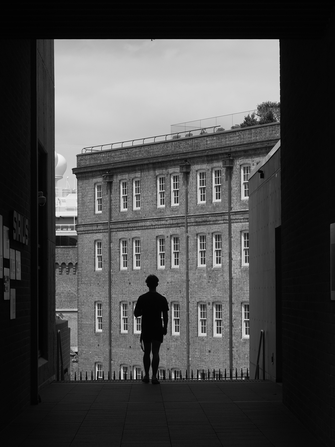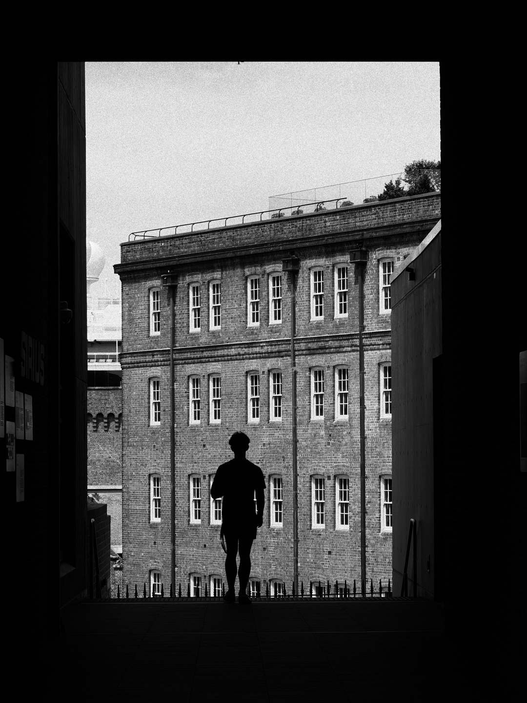 THE額縁構図となる場所を見つけました。通常のモノトーンとMP2とを比較すると、床や壁のディテール、奥の建物のレンガの質感、そして空の部分で粒状感の違いがわかります。