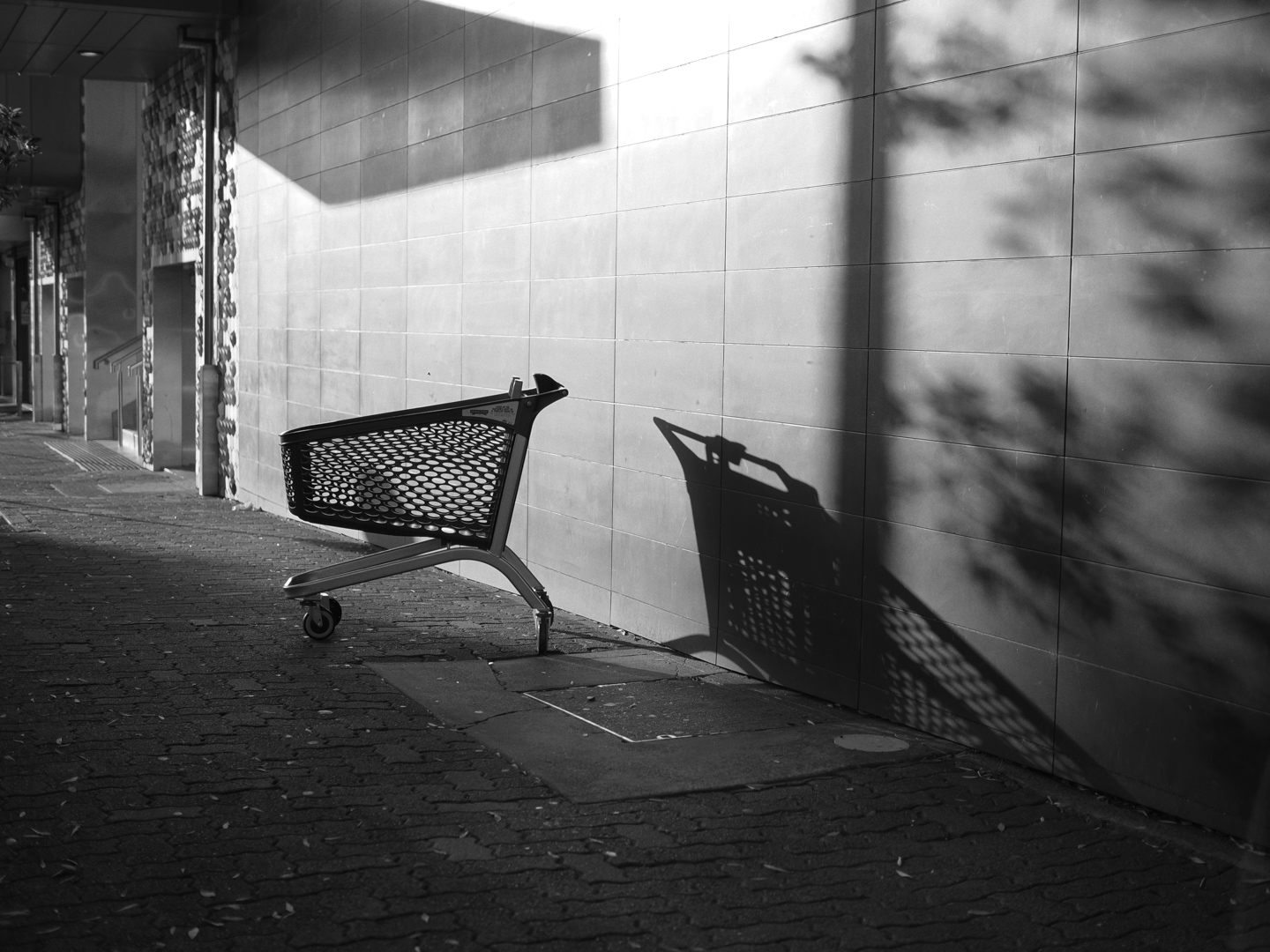 放置されたショッピングカートが夕方の光を受けて、長い影を伸ばしていました。MP4にすることで夕方のやわらかい光の中に佇む様子が伝わってきます。