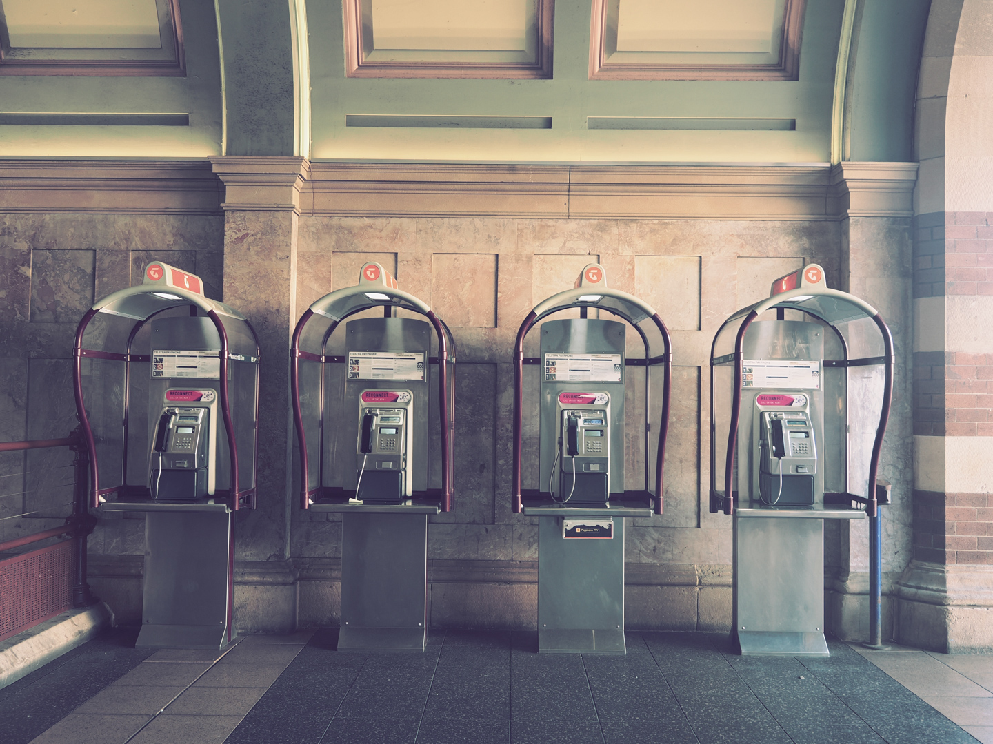 クラシカルな駅の片隅に並んだ公衆電話。公衆電話というモノそのものがもはやレトロに感じられたので、ヴィンテージを選んでみました。