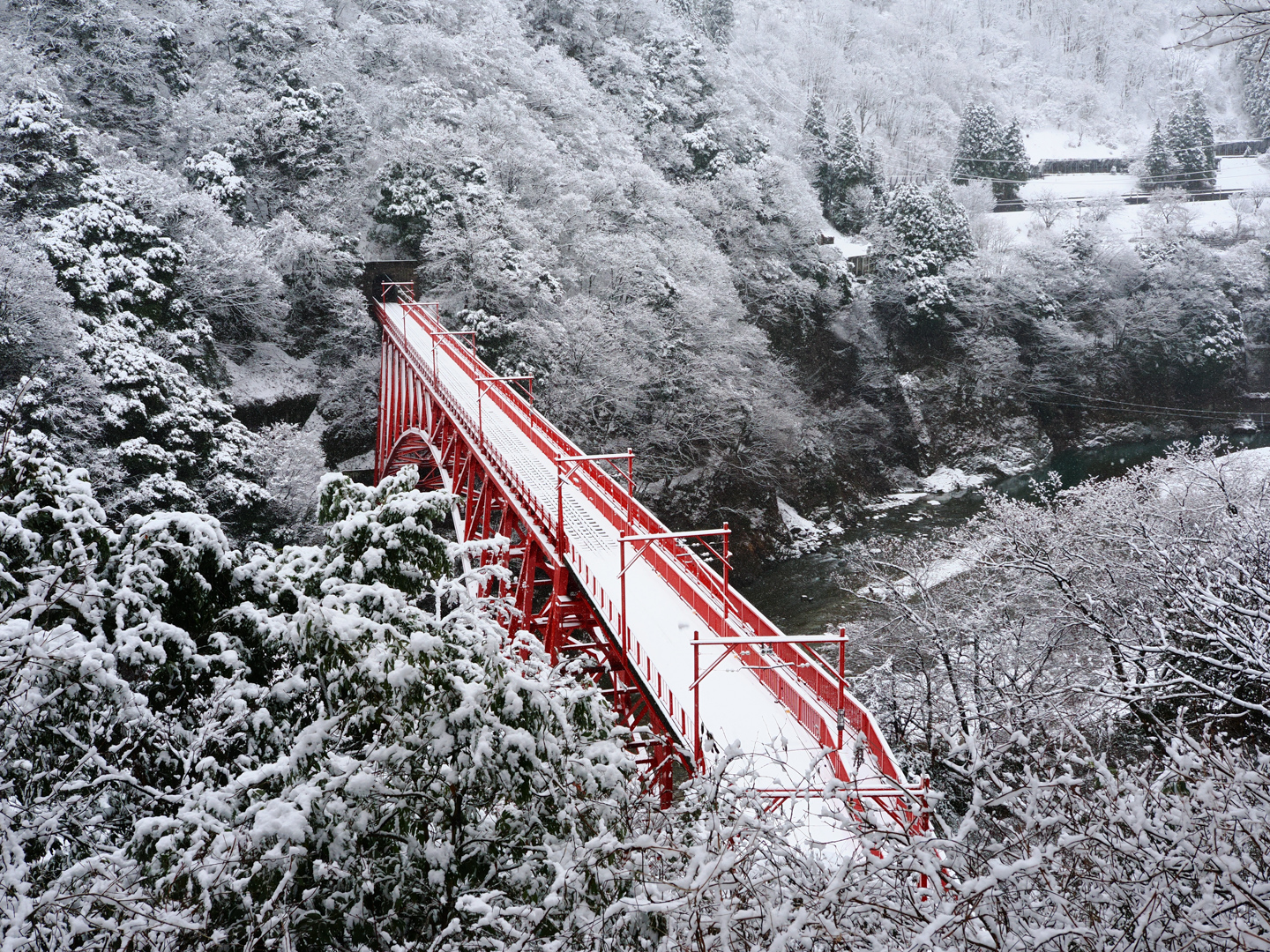 富山の宇奈月温泉へ出かけた日、夜の間に雪が降り、朝起きると景色が一変していました。大急ぎでトロッコ列車の鉄橋を見下ろせるポイントへ。赤い橋の印象を強くするためにCP3でしっかり色を出しました。