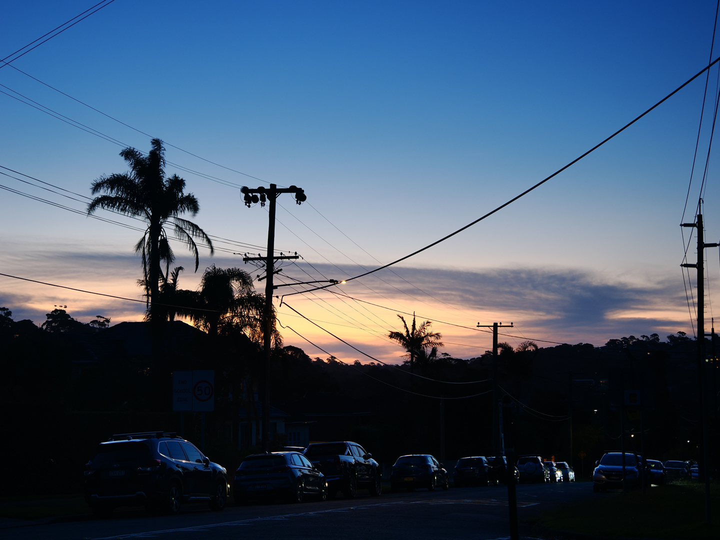 シドニーは夏の間、Daylight Saving Time(サマータイム)の影響で日没が遅く、2月上旬は夜8時を過ぎてようやく暗くなります。ある日、ステイ先に戻る途中のマジックアワーの空と街並みを撮影。ライブGNDを用いて空の部分にNDフィルターをかけたことで、路肩に並んだ車の列が綺麗に浮かび上がりました。