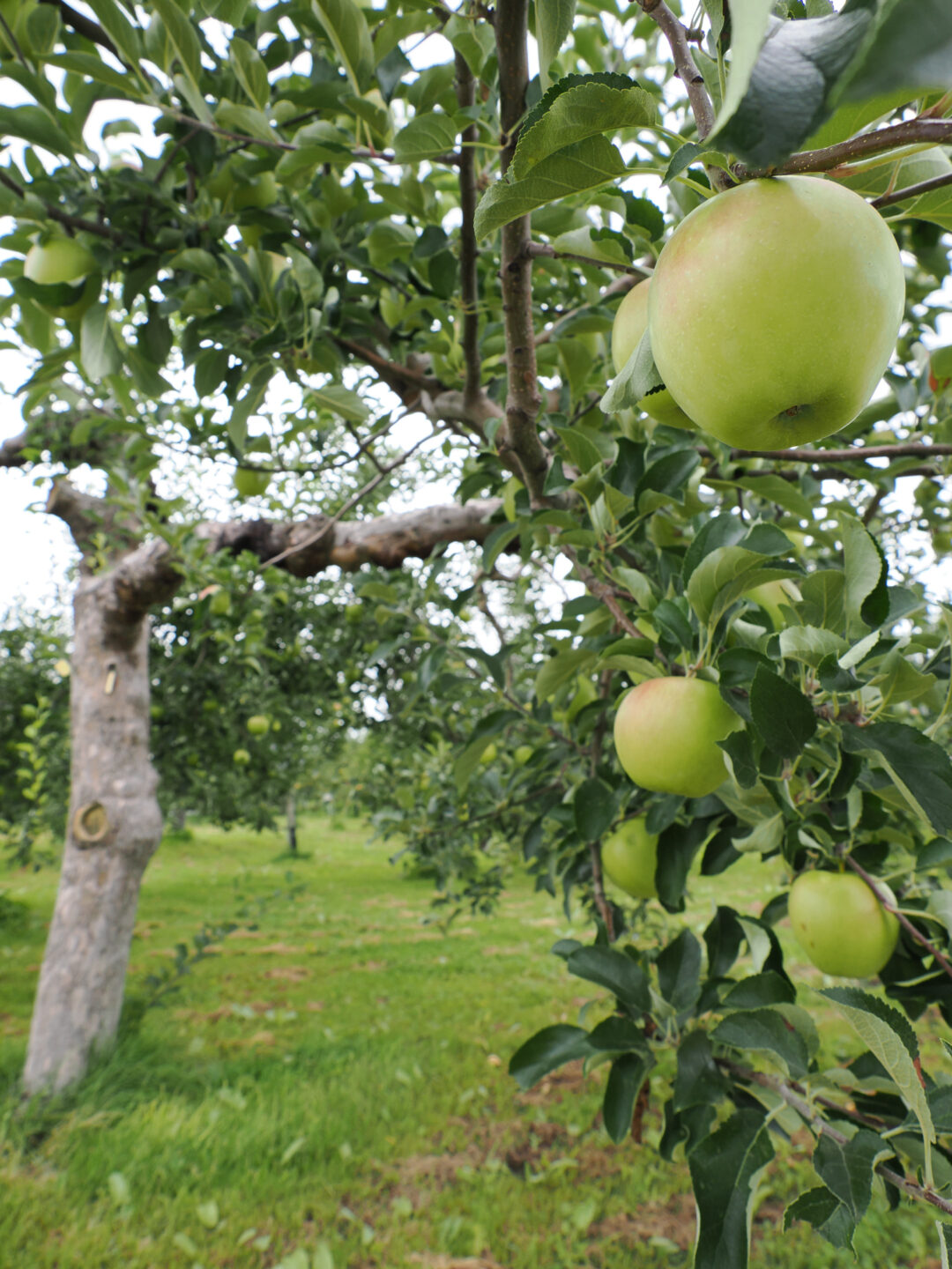 同じく絞りはF6.3に設定し、今度は一番広角側で主役となる被写体のリンゴにぐっと寄って撮影。広角ゆえに背景が広く入り、リンゴ園の奥行きが感じられる写真となりました。上記の望遠と絞り値は同じF6.3ながらも、広角では被写界深度が深くなるため、背景も望遠の時のようなボケを得られることはなく、リンゴたちが実っている様子がしっかり見て取れます。