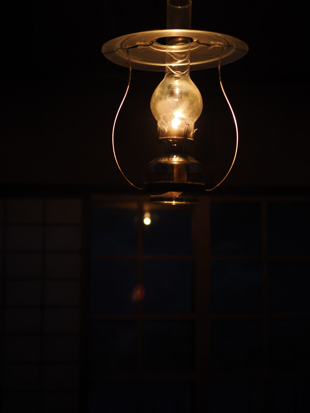 この日、午前中のリンゴ公園、そしてこの宿に向かう途中の町の黒石までは晴れていたものの、山奥のこの宿に到着する手前から雨が降り出し、その後かなりの大雨に。到着したのが夕方な上に雨という天候で、通された部屋は既に薄暗く……。すぐにレンズは明るい単焦点に交換してまずは一枚。部屋の明かりはこのランプひとつのみ!