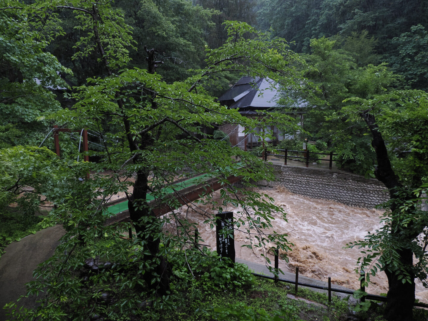 夜半からの大雨が続く中、翌朝起き抜けに窓の外を見てびっくり!前日はちょっと水量が多いかなぁという程度の、きっと日頃は綺麗なせせらぎであろう川が溢れんばかりの濁流に。流石に危険だからと吊り橋は立ち入り禁止となり、川向こうの温泉へは行けなくなっていました。