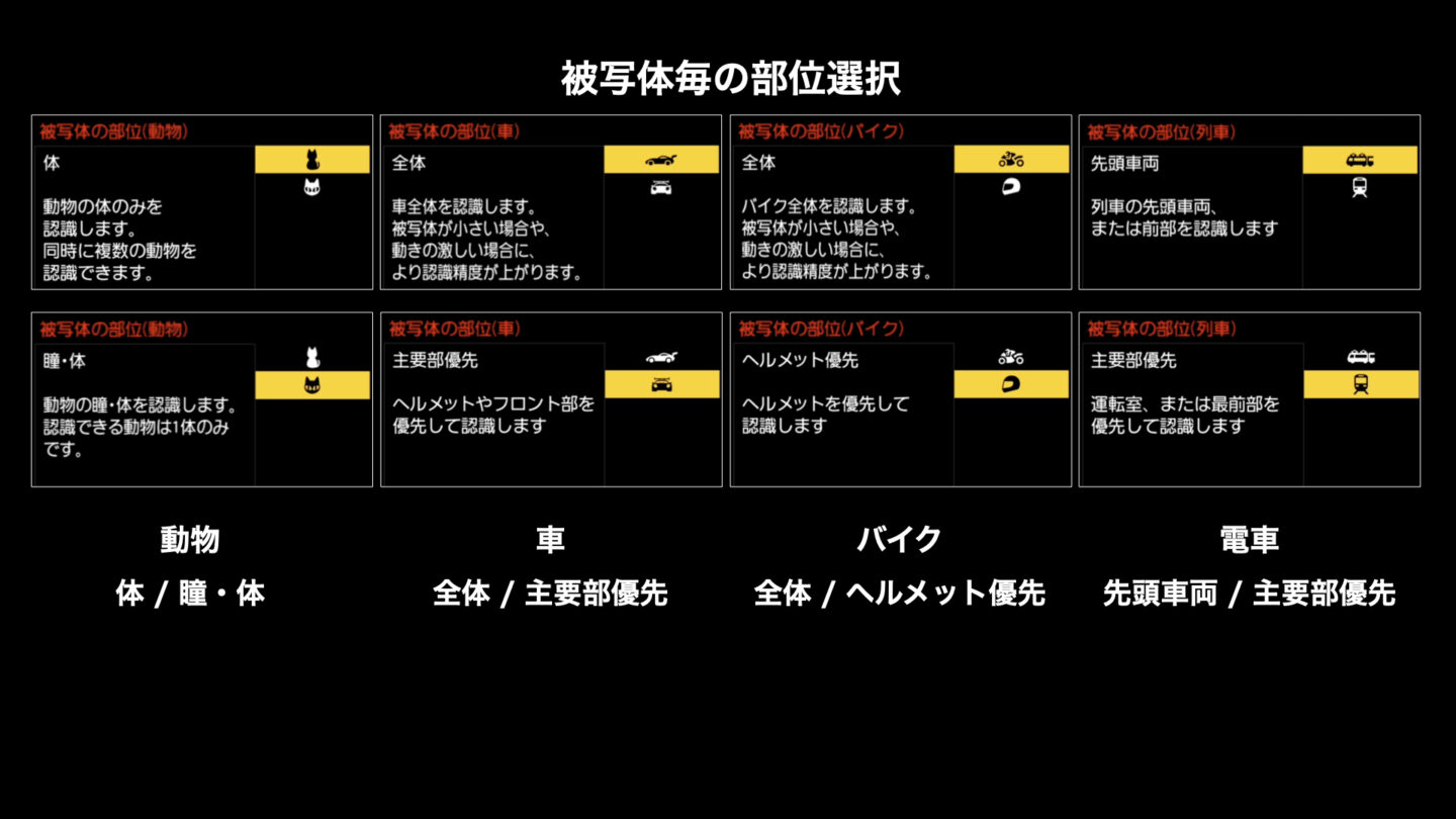 前述のようにGH7はオートフォーカスが大きく進歩しました。特に認識AFが人物・動物・車・バイク・列車・飛行機と、今までのLUMIXに比べて認識する被写体が増えました。また、ピントを合わせる部位もそれぞれの被写体の中で選択することが可能になっています。