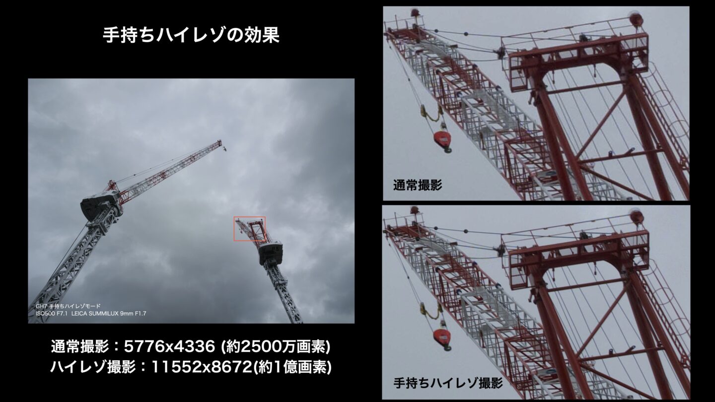 加えてGH7は手ブレ補正の精度が高いため、手持ちでもハイレゾモードが可能になっています。