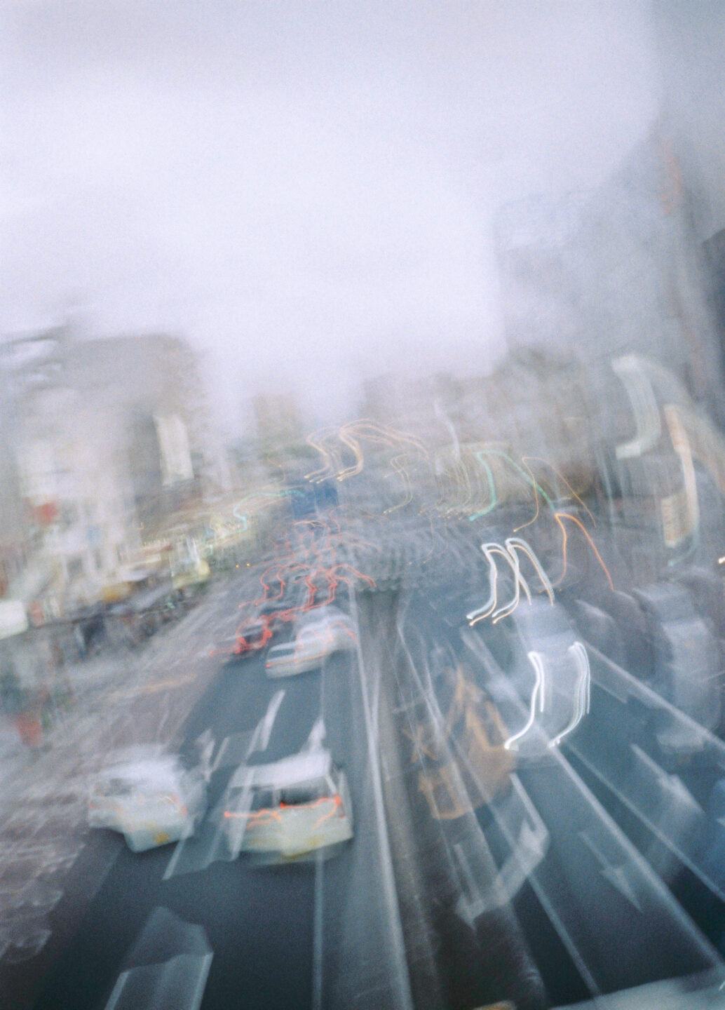 暗くなってきた頃、歩道橋から行き交う車を見るのが好きです。