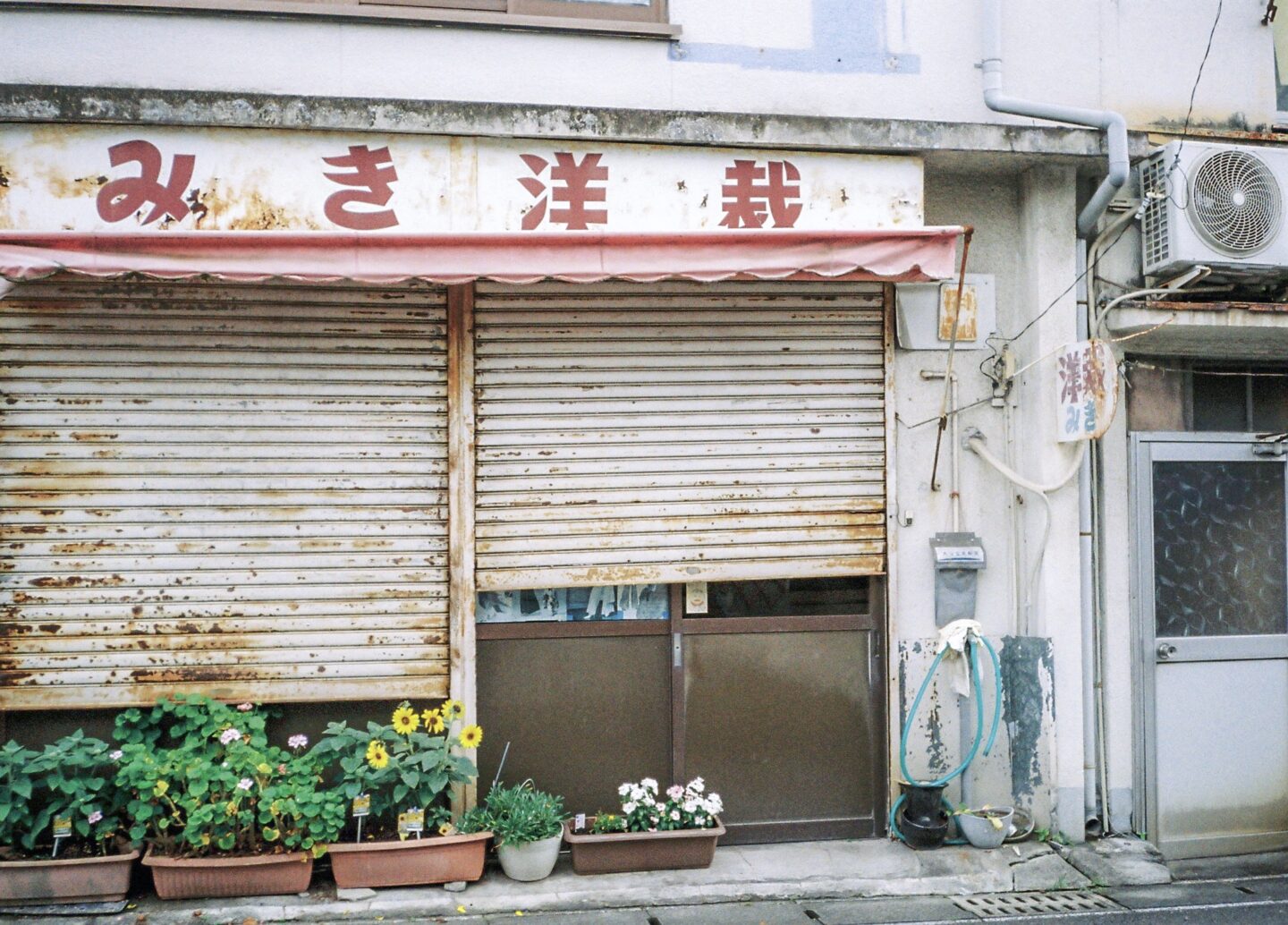 街を歩いていると見つけた、フォントが昔ながらの看板。さびれたシャッターの開き具合が絶妙で花たちを魅せるパフォーマンスのように感じました。