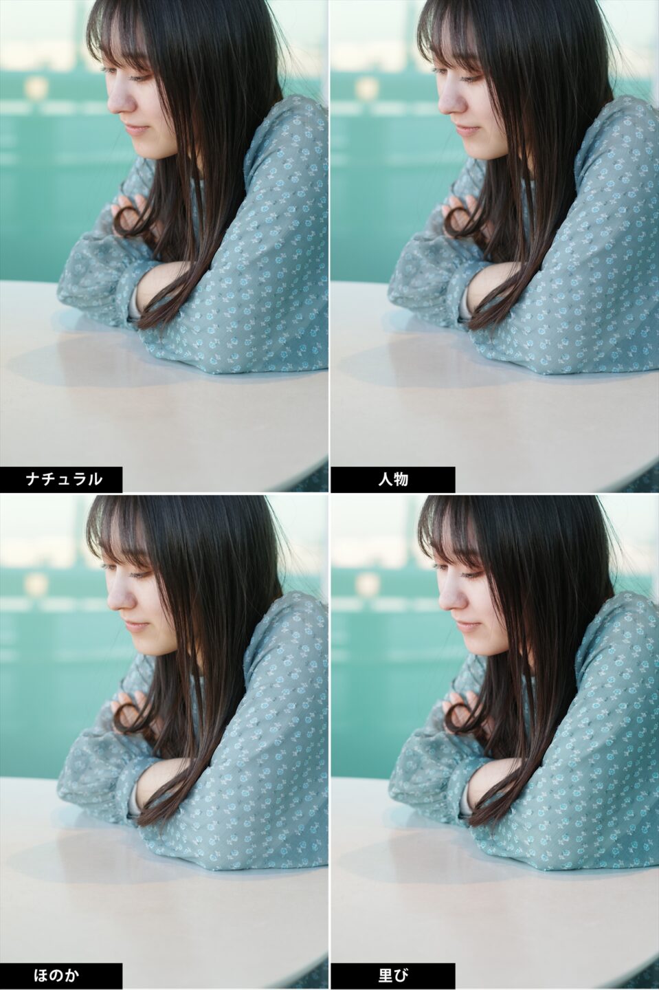 今回は、淡く優しい表現にふさわしいカスタムイメージをセレクト。ポートレートでは、カスタムイメージ「人物」に限定するのではなく、モデルさんの雰囲気やファッションのテイスト、髪・瞳の色、メイク、そして光の状態に合わせて選びます。