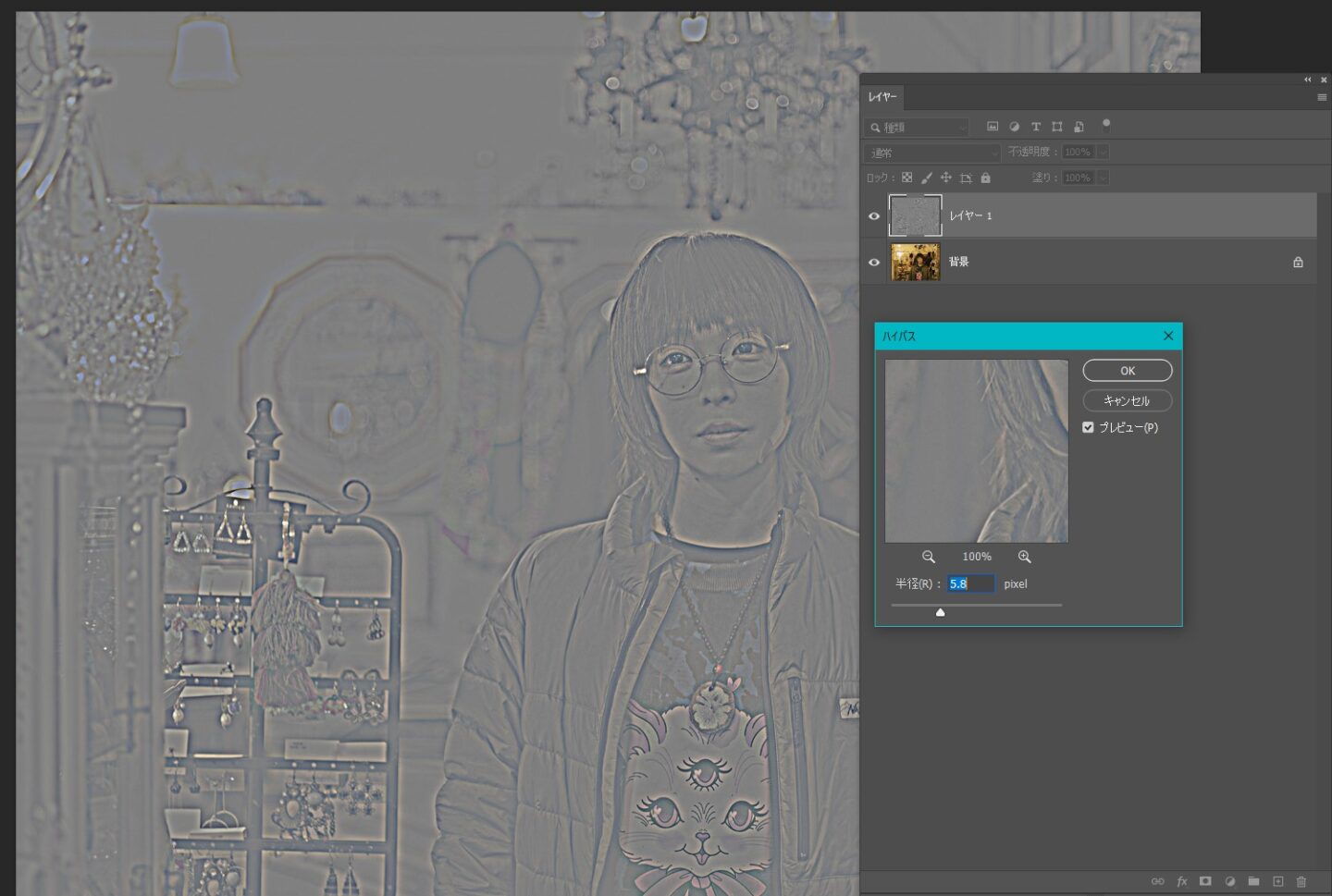 参考までにPhotoshopでエッジを立てる方法としてアンシャープマスクの他に、ハイパスを使う方法がある。こちらは応用範囲も広いので簡単に紹介しておく。レイヤーを複製し、図のように上のメニューバーから、フィルター>その他>ハイパスと進み、プレビュー画面を見ながら適切な量をかける。そしてそのレイヤーの合成モードをソフトライトにする。もし効きが強すぎた場合は不透明度で調整するとよいだろう。細かく言えばアウトフォーカスの部分やオリジナルのままでいい場所もあるので、マスクでハイパスをかける範囲を調整するとよいのだが、本稿の趣旨とずれてしまうのでそこは割愛する