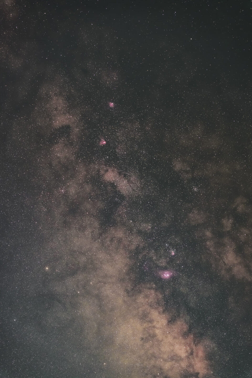 さて、こちらのレンズで撮影した星空の画像はこちら。天の川中心部にある「バンビの横顔」という領域を撮影しています。この日は少し透明度の悪い空でしたが、それでも性能評価はできると思います。