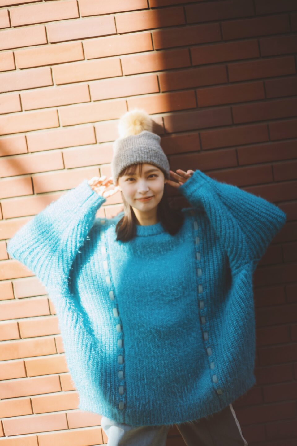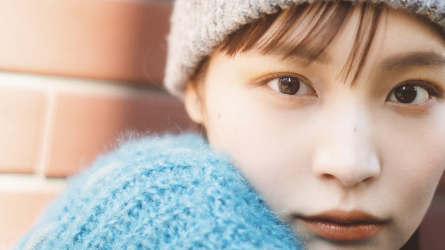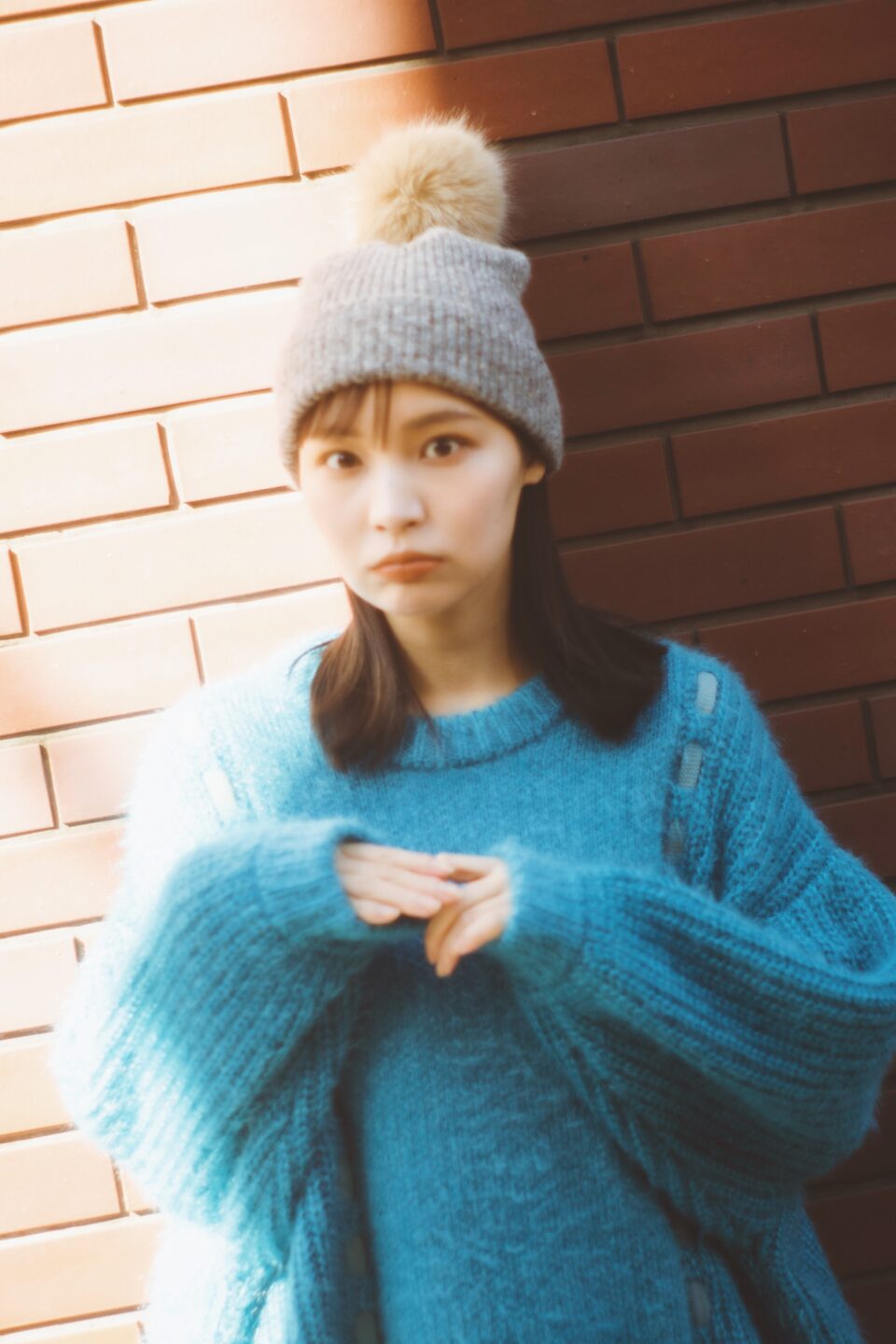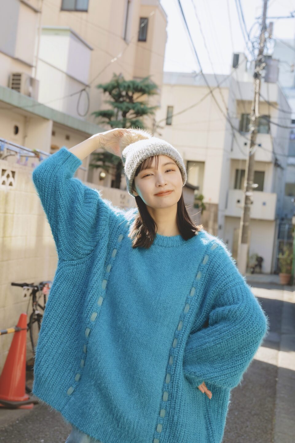 肩が寄ることで可愛らしい印象になり、またそれだけでなくニットの素材やブルーの寒色が入り冬らしさも表現しています。