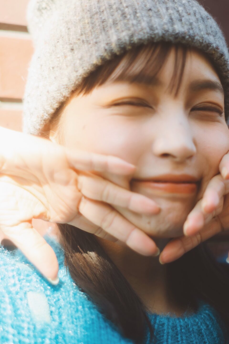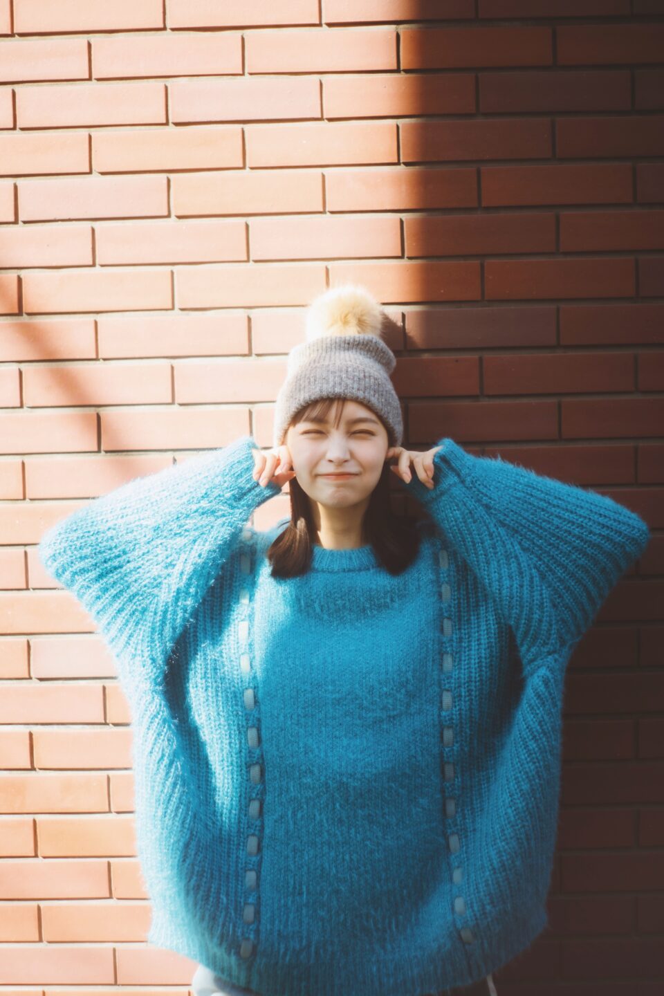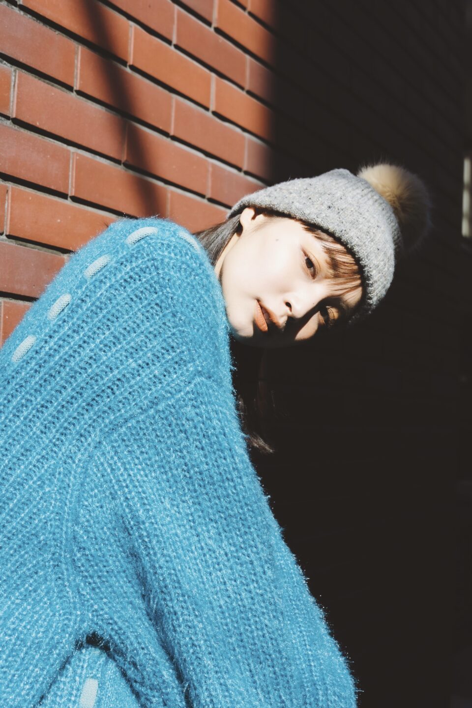 レンガの茶色い壁に、顔の肌色だけでは寂しい印象になってしまうので、バランスを見て服の色を少し入れるのもこだわりの撮影テクニックの一つです。