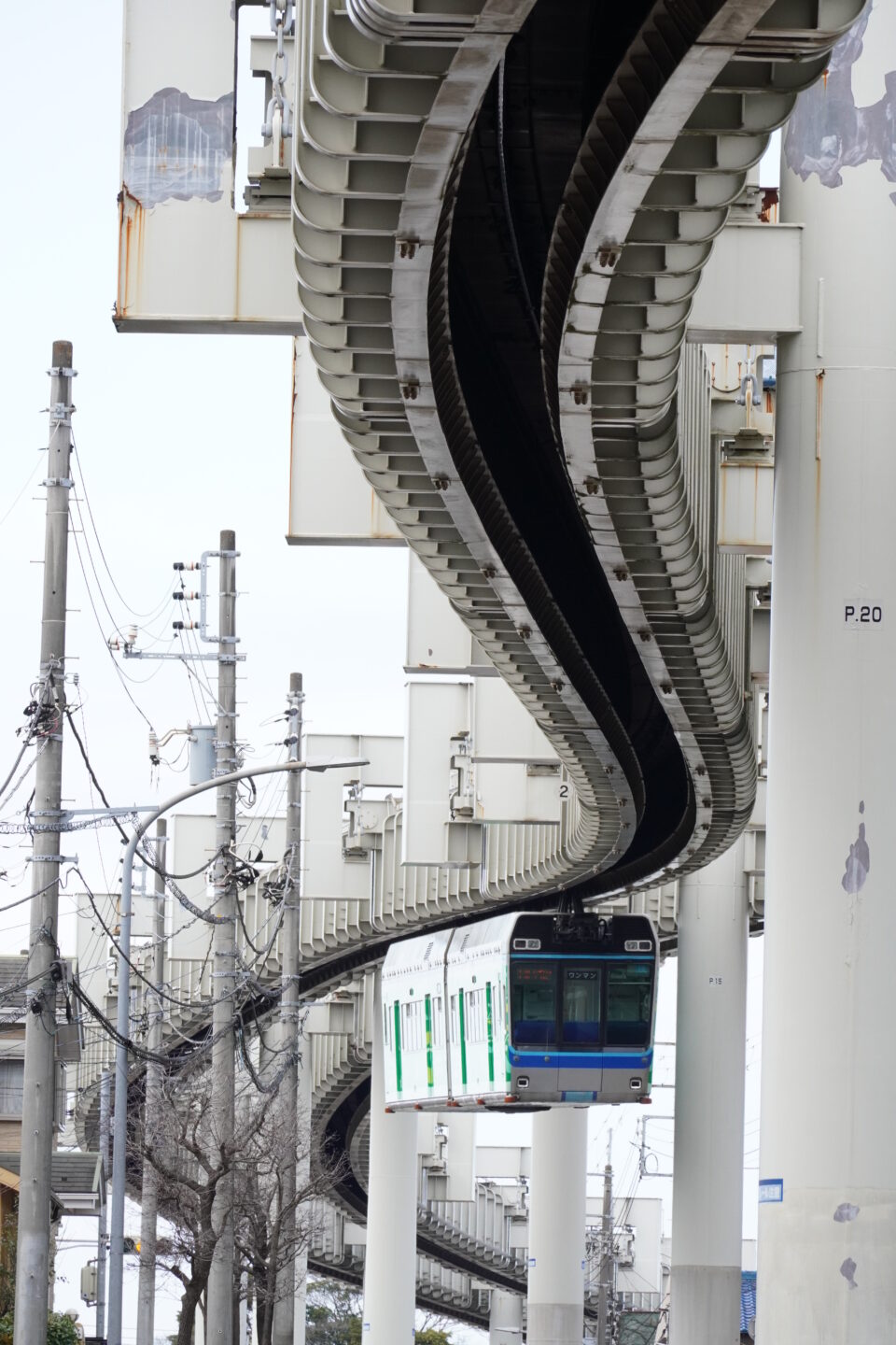 動物園行くために利用したモノレールのカーブするレールの造形が面白く、望遠レンズの圧縮効果を利用して切り取ったものです。1枚目は単純にレールの曲線の美しさと連なる支柱を都市風景としてワイド端350ミリで圧縮した作例。