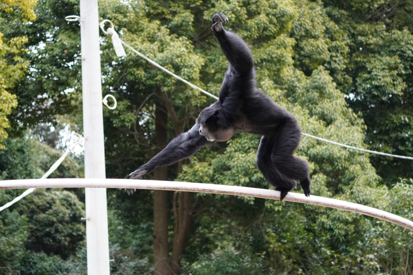 暫く動きがなさそうなので、一旦サル山から離れフクロテナガザルのエリアへ。大きな体格と長い両腕、喉元を風船のように膨らませて吠えるように鳴くのが特長的なサルです。一枚目はまずズームのワイド端70ミリで雲梯にぶら下がる様子を撮影したもの。