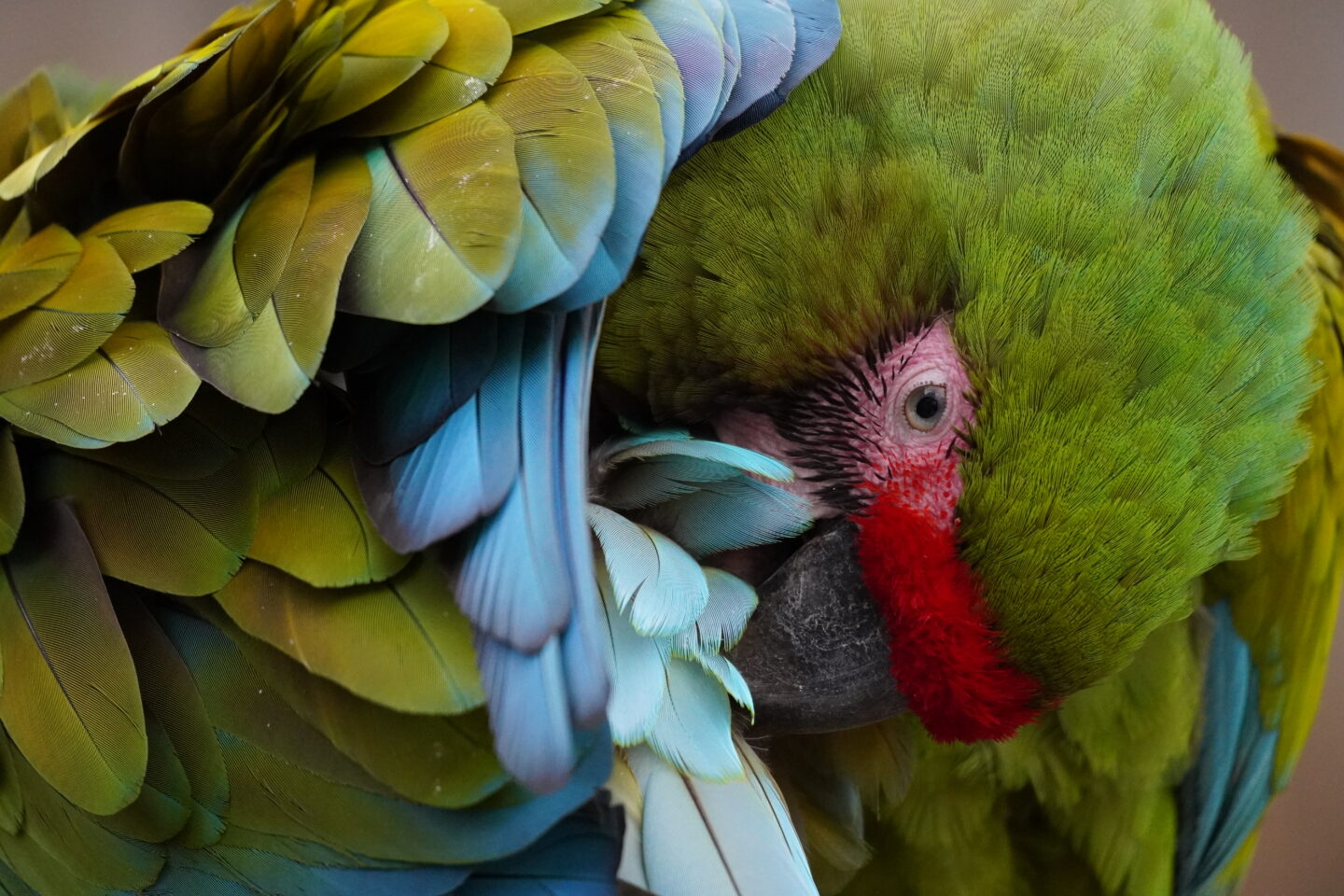 ニホンザルたちの動きがまだ小康状態気味なので子ども向けの展示エリアに移動してきました。ここもサル山と同様にフェンスや窓越しではなく被写体を直接撮影できるのです。その目的はヒワコンゴウインコの羽根。Gレンズは繊細な造作だけでなく、緑や青のグラデーション、そして嘴の上のひときわ鮮やかな赤色の羽根もリアルに描写できています。