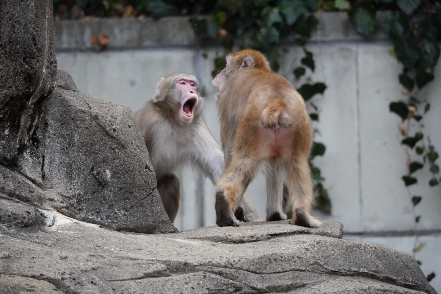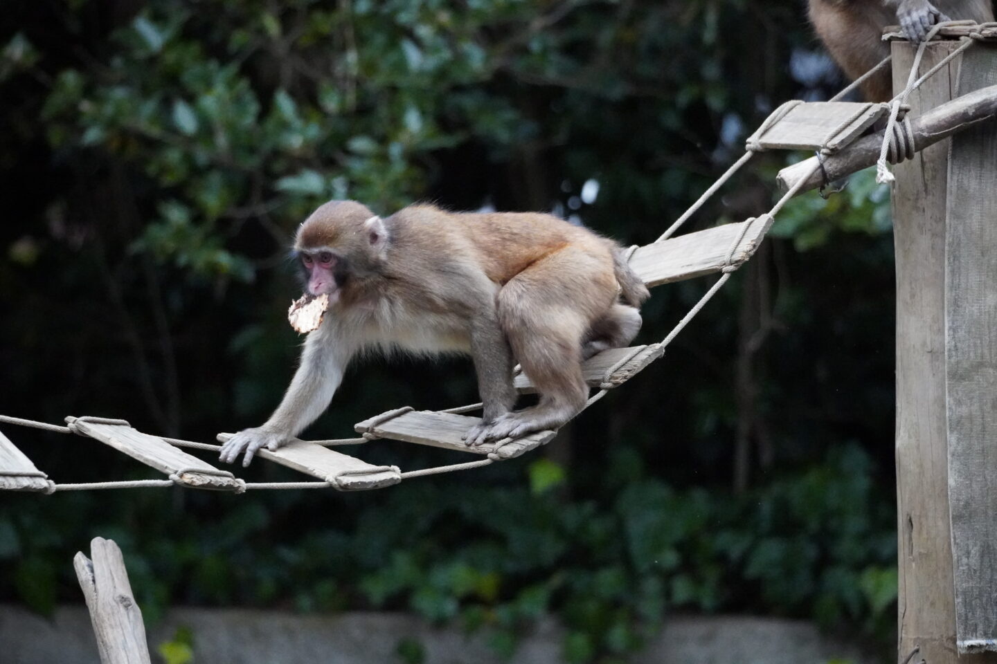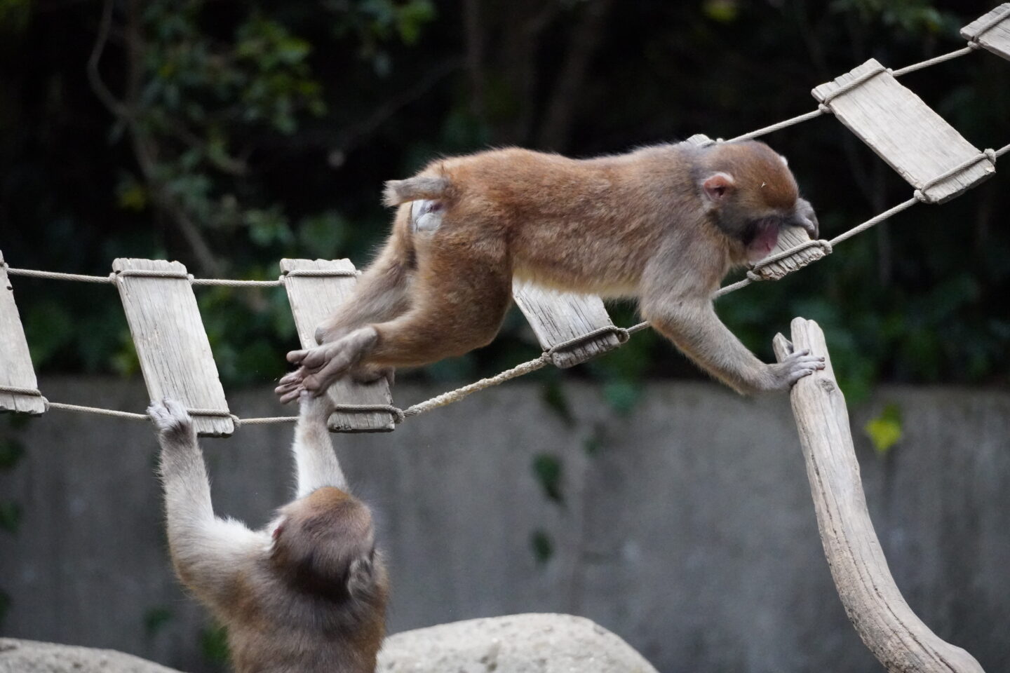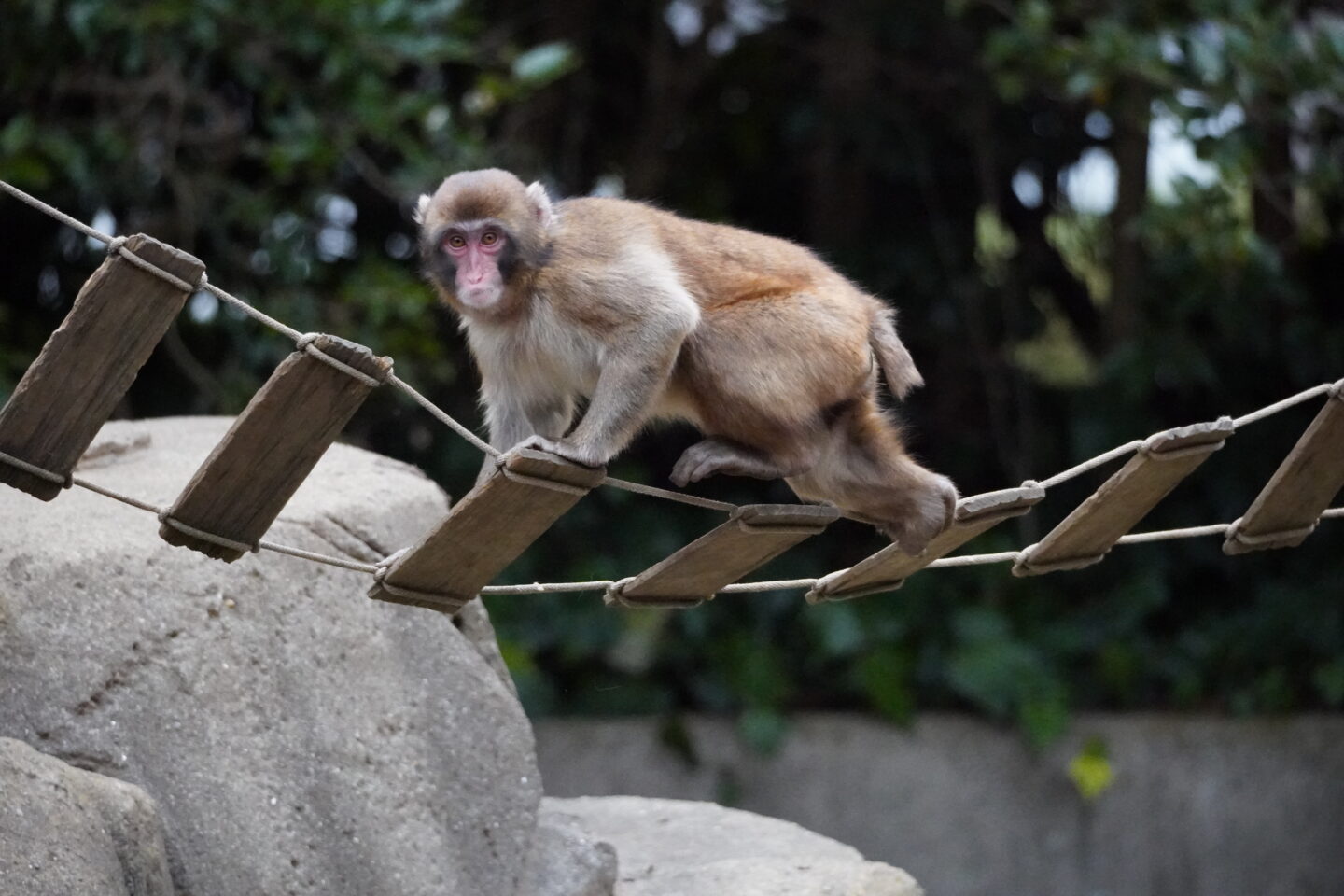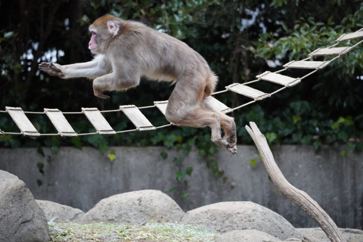 少し深めに掘られた展示エリアの中央にあるサル山ではニホンザルの木登りや、ロープや梯子などに飛び移る動作など活発な動きを観察できる園がほとんど。サルと同じ目線の高さや、見上げたり、見下ろしたり様々なアングルで撮影できる点でも恰好の被写体といえるのです。