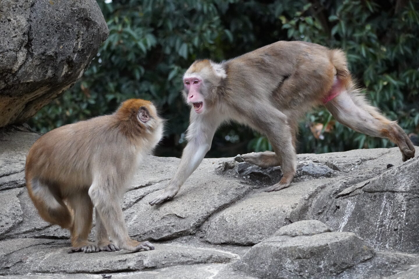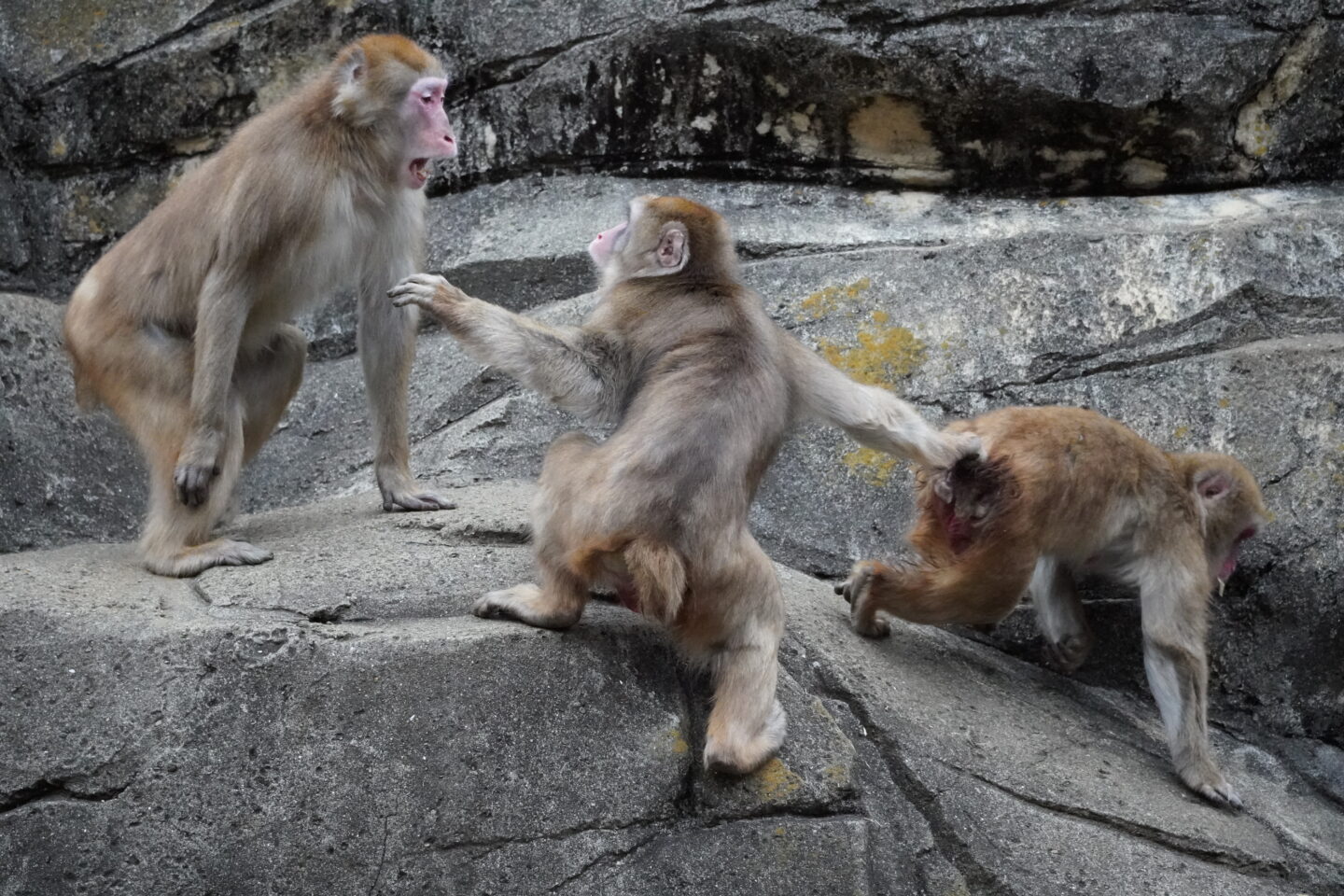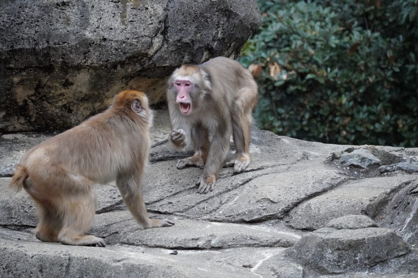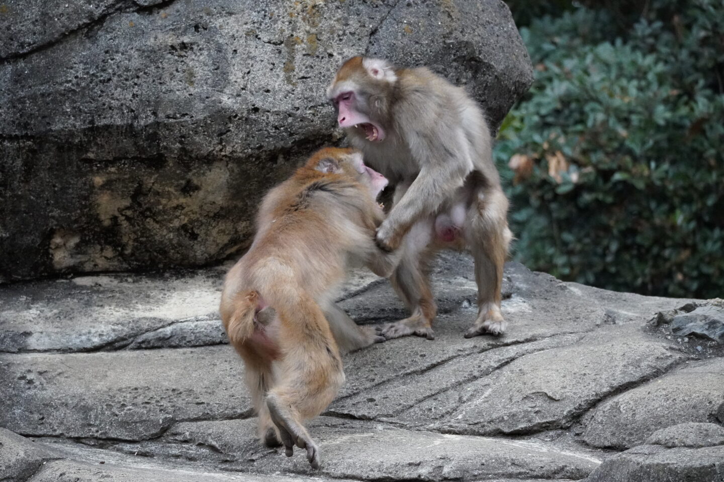 一触即発といった雰囲気。人間同士同志の喧嘩なら撮っている場合ではないですが、ここ(サル山)ではどんどん撮る場面。何故ならシャッターチャンスの時間はそれほど長くは続かないからです。2匹の攻防も気にしながら周りに目をやると、さらに活発に跳びまわる若い個体もいてどちらにレンズを向けるべきか迷います。
