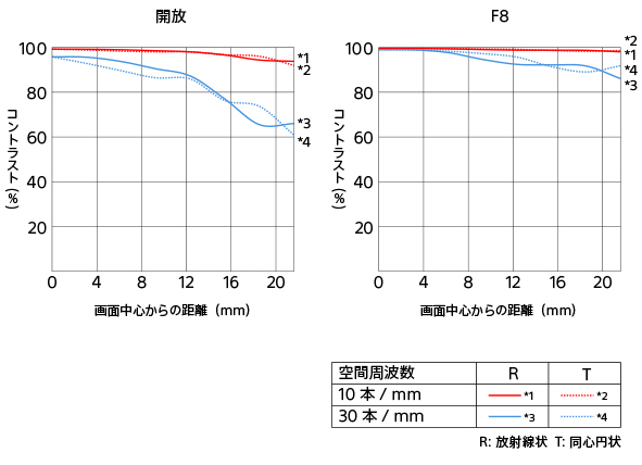 また、実線(放射方向)と破線(同心円方向)との間隔が狭く均一である点にも注目してみましょう。この間隔が狭く一定であることは、レンズが軸上収差や非点収差をほぼ完璧に抑制していることを示しており、画像の均質性を確保する上で極めて重要な要素となります。これが撮影実践上も、超広角レンズ特有の画面端の歪曲や描写の乱れをほとんど感じさせない安定した描写を可能にしている要因と言えるでしょう。