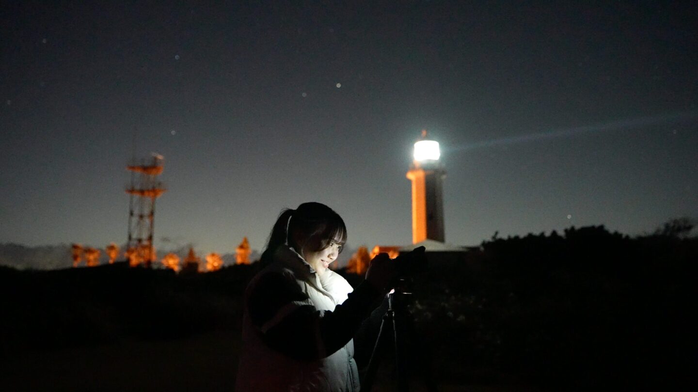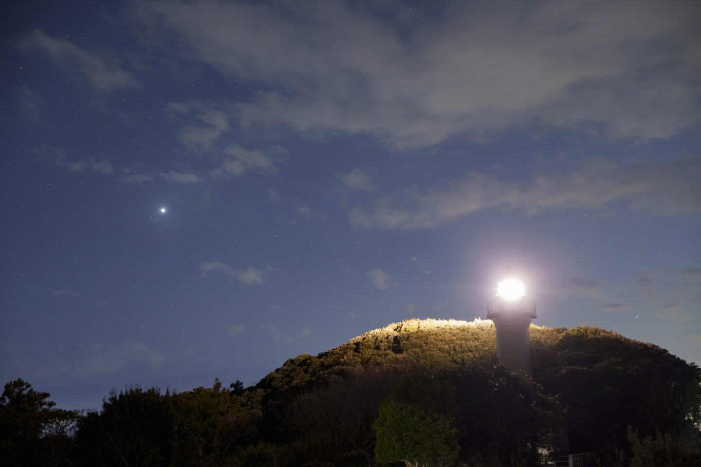 一つの例として、回転する灯台の明かりと一緒に星を撮影するシーンをご紹介します。シャッタースピードを長くすると、灯台の明かりが一周ぐるっと回る過程がすべて記録されるため、1枚目の写真のように光が拡散しボワっとしたような写真になります。一方、シャッタースピードを短くすると、灯台の明かりが回る間の一部の過程だけを切り取ることができますので、2枚目の写真のように光の筋が伸びたような写真を撮影することができます。この時は金星が灯台のそばにあり、まるで金星を照らすサーチライトのような作品を撮ることができました。このようにシャッタースピードを速くしたい瞬間というのは星景写真の撮影シーンで多いため、F2.0という開放F値の恩恵は大いにあると言えるでしょう。