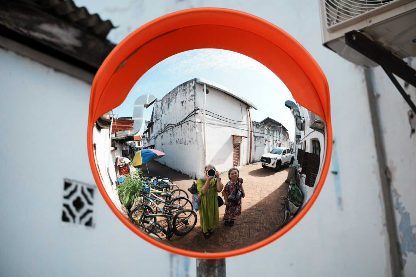 150mmの圧縮を使いながら裏路地を歩く友達を撮ったり、カーブミラーに映る自分たちを背景を入れ込みながら50mmで撮影する。