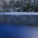 青空が映り込む池と、湖畔の新緑が美しい場所を訪れました。標準レンズを装着し、俯瞰するように構えて撮影。黒々とした針葉樹が並ぶ対岸を入れず、水面と手前の新緑だけで構成して、「青と緑の対比」を引き立てています。逆光気味にカメラを構えて新緑の美しい透過光を捉えていますが、どこかインパクトに欠ける写真になりました。