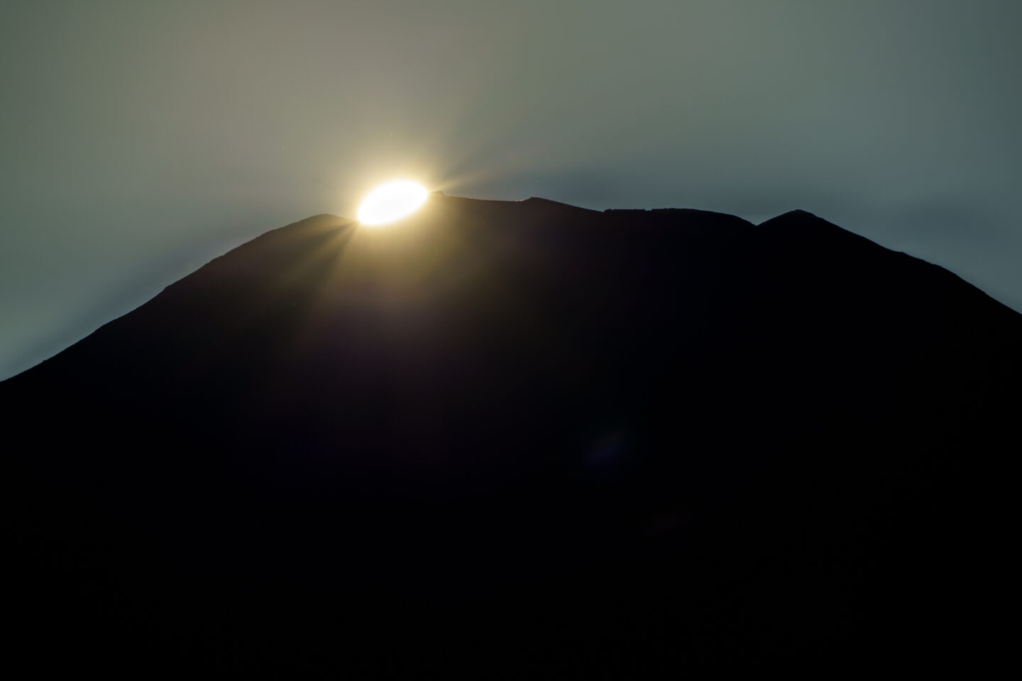 ゴーストを最小限にして美しい光条を得るためには、富士山頂に太陽が半分から2/3くらい隠れるタイミングが良いとされています。それは太陽が富士山頂に多く隠れているほど逆光が弱まってゴーストが目立たなくなるということが理由の一つですが、隠れすぎるとダイヤモンドの輝きが弱くなるのでシャッターを押すタイミングがとても重要となります。