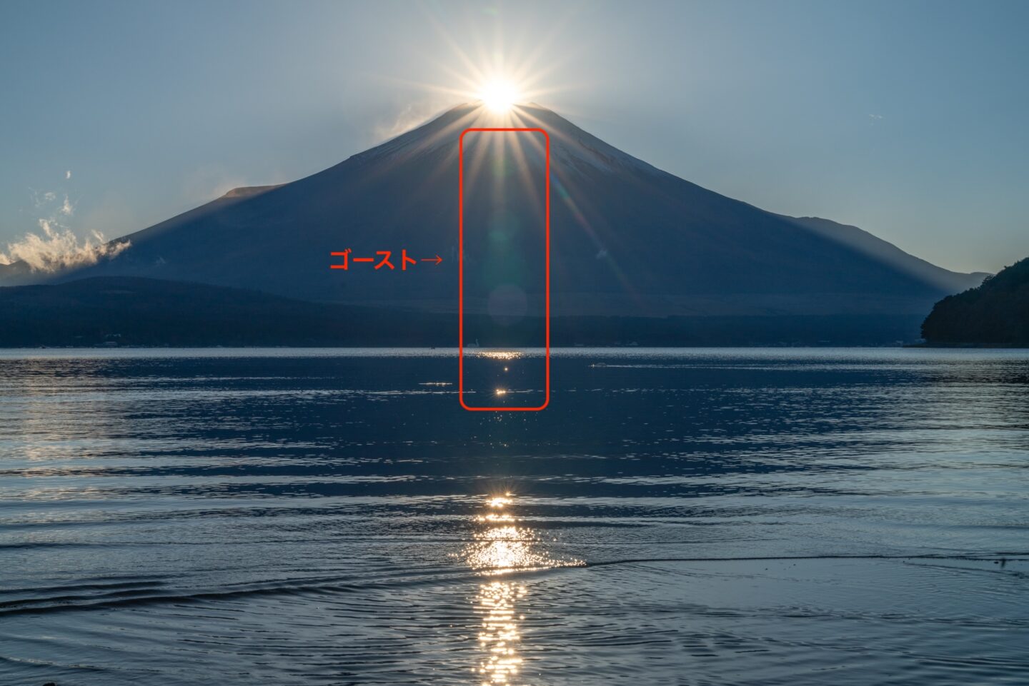 ダイヤモンド富士の撮影では太陽光を真正面からレンズに迎え入れることになるため、強烈な逆光によるハレーションやゴーストが出ることは避けられません。コーティングや鏡胴内塗装技術が向上した最新レンズではそれらの発生が抑えられるようになりましたが、発生をゼロにすることはできないため、綺麗に撮れたダイヤモンド富士の写真も多くの場合どこかにゴーストが写ってしまうものです。