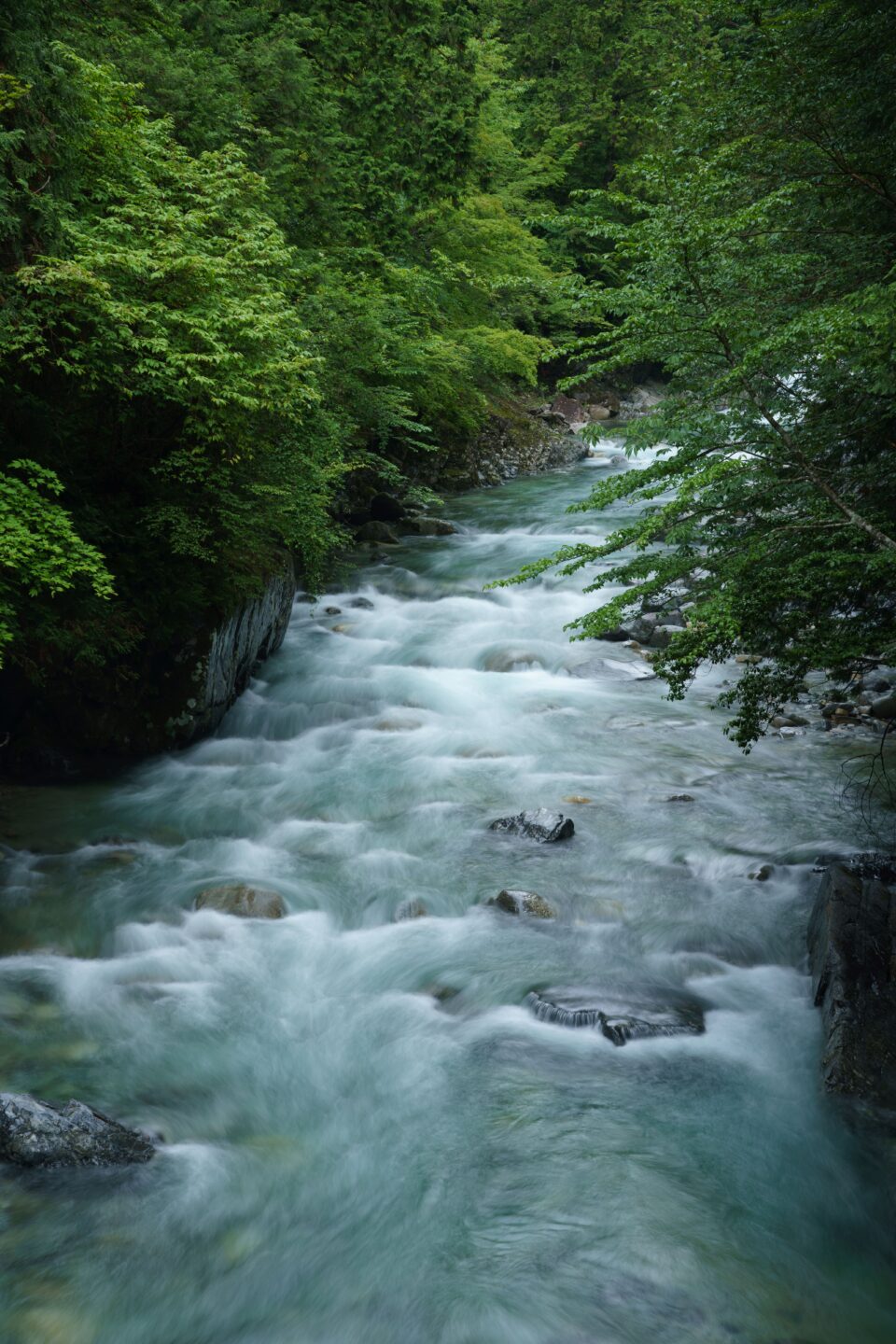 低速でも高速でもないシャッタースピード(1/15秒~1/125秒くらい)は水の流れがやや中途半端に写ってしまう印象ですが、それがちょうど良いと感じるシーンもあります。流れ表現の基本は低速or高速シャッターだと考えていますが、そのいずれもうまくいかない場合や意図がある場合に試してみると良いでしょう。