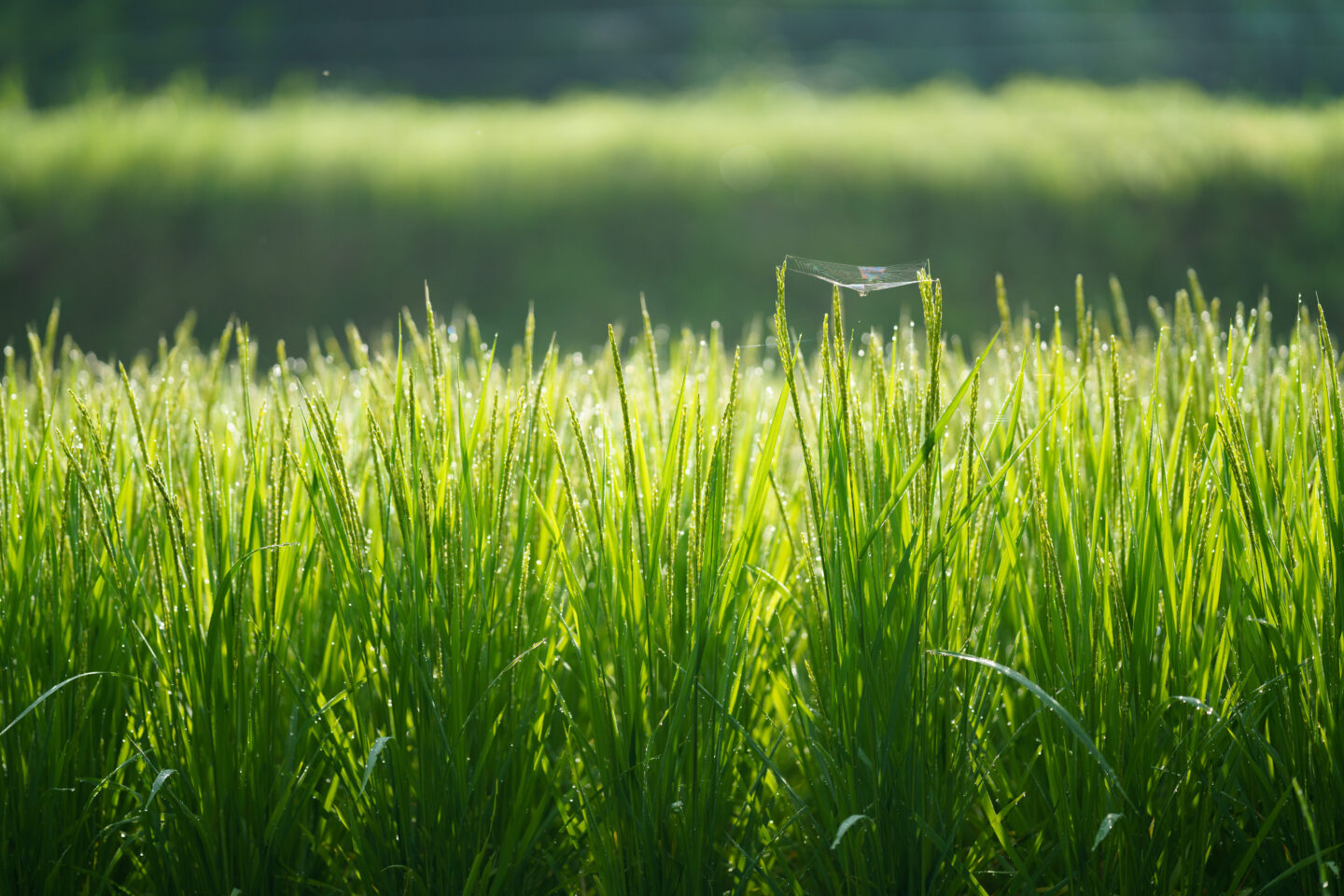 朝露のおりた早朝の田んぼに蜘蛛の巣が光ります。陰影を生かし、背景が日陰になるようカメラの高さを調節して撮影しました。